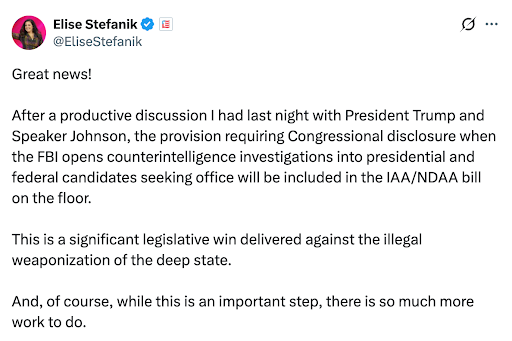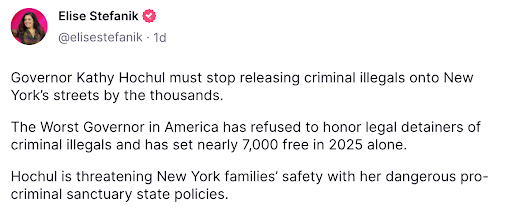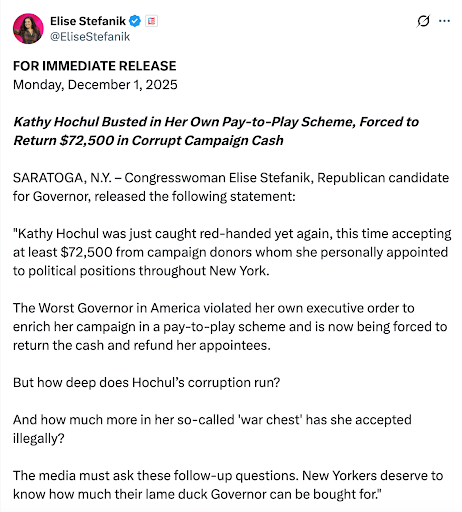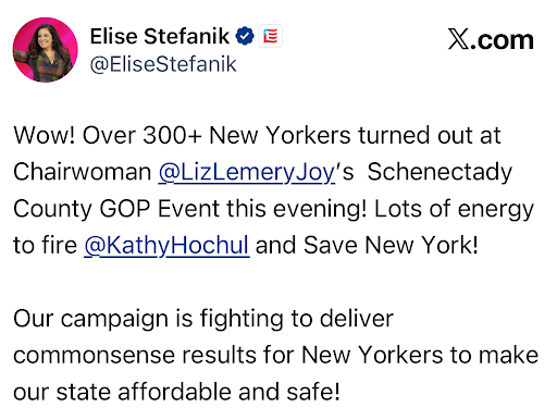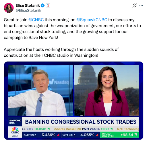 | Welcome back to Team Elise's weekly newsletter! We send a weekly note to Elise's top supporters to update you on what she's working on in Capitol Hill and across NY-21! | | Here are a few top Team Elise updates and stories we have been tracking for the past week! | | Elise at Schenectady County GOP Event! | | Elise Joins ‘Squawk Box’ on CNBC | | Elise Interview w/ Tara Rosenblum from News 12 | | Elise Calls for Vote on Banning Congressional Stock Trading | | "Throughout my entire 11 years in Congress, I have never purchased or traded a single individual stock because I believe it is unethical. Meanwhile, we have seen Members of Congress in both parties abuse their position in elected office by making millions on stock trades—no one has been more corrupt in this practice than former Democrat Speaker Nancy Pelosi. This bipartisan, commonsense, good governance discharge petition will finally crack down on the corrosive decay of a Congress that is failing the American people—particularly New Yorkers who are struggling with an affordability crisis created by Kathy Hochul.” | | Elise Secures NDAA Provision to STOP Illegal Weaponization of the Deep State | | SEE more on Elise’s X page HERE. | | Elise Slams Hochul for Releasing Criminals | | SEE more on Truth Social HERE. | | Elise Joined Supporters in Orange County! | | “New Yorkers across our state are struggling with the historic affordability crisis under Kathy Hochul's single-party Democrat rule. New Yorkers in Orange County like my friend County Executive Steve Neuhaus are working with our campaign to Save New York. Thank you to Orange County for the warm welcome and sharing your enthusiasm for our campaign. 🗽🇺🇸” | | SEE more on Elise’s Facebook here. | | Elise: Hochul Caught Red-Handed in Pay-to-Play Scheme | - DAILY WIRE: Stefanik Blasts Mamdani, Hochul Over Wild Anti-Police Appointment