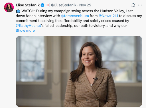 - NEWS 12 LONG ISLAND: 'Enough is enough.' Rep. Stefanik sits down for 1st local TV interview since launching bid for governor
