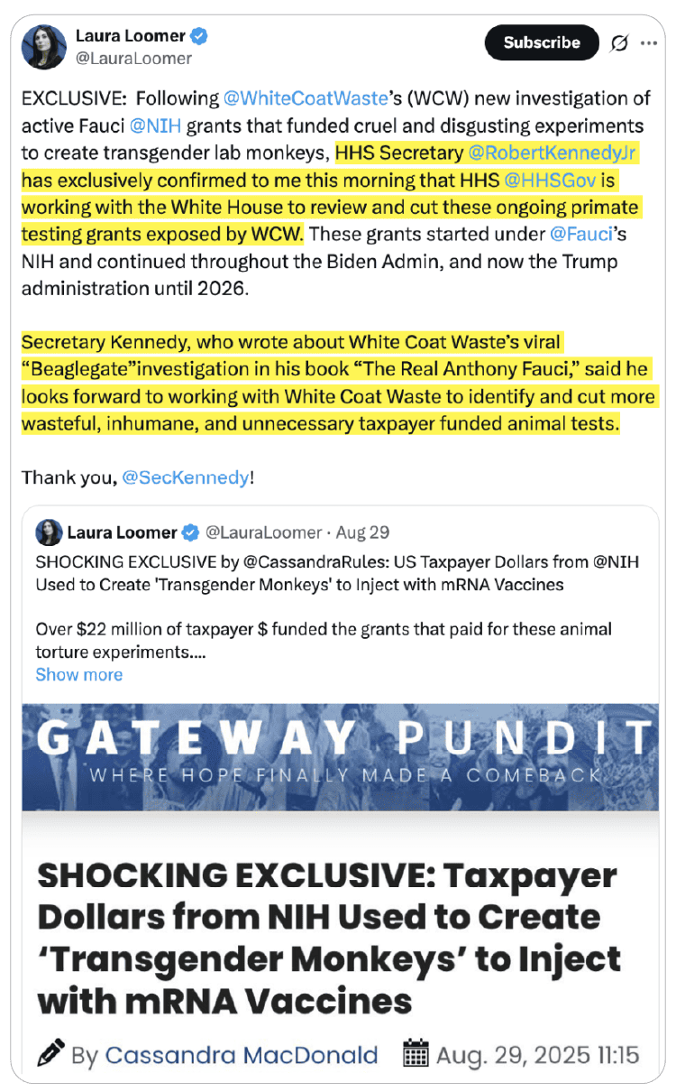 In August, Laura Loomer reported, “Secretary Kennedy, who wrote about White Coat Waste’s viral ‘Beaglegate’ investigation in his book ‘The Real Anthony Fauci,’ said he looks forward to working with White Coat Waste to identify and cut more wasteful, inhumane, and unnecessary taxpayer funded animal tests.”