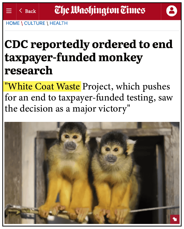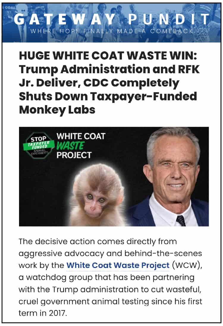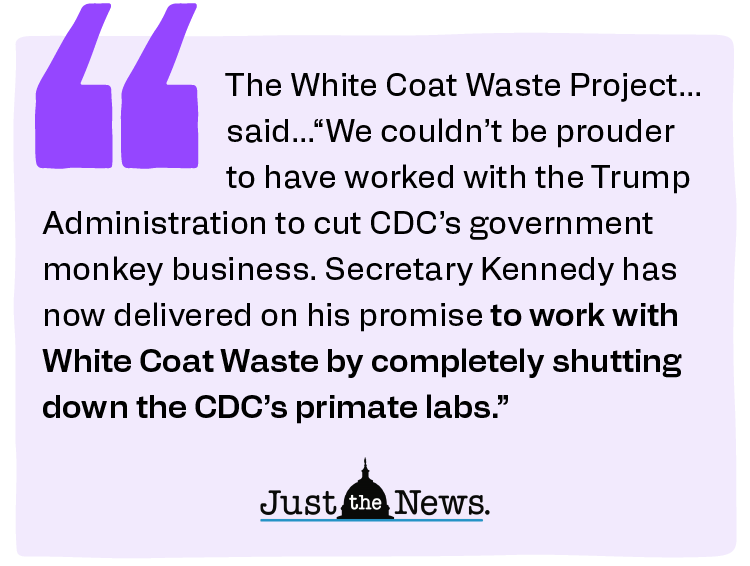 “This is another historic White Coat Waste victory — and we couldn’t be prouder to have worked with the Trump Administration to cut CDC’s government monkey business. Secretary Kennedy has now delivered on his promise to work with White Coat Waste by completely shutting down the CDC’s primate labs, where hundreds of victims were infected with smallpox, Ebola, hepatitis, and HIV-like viruses at taxpayer expense by Dr. Fauci and other mad scientists.