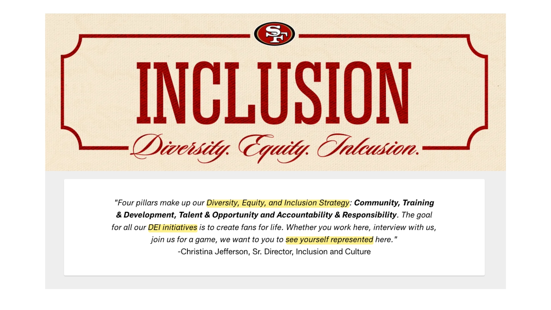 DEI is still front and center in the 49ers' employment playbook. The 49ers’ President, Al Guido, has stated that the team is committed “to modeling the diversity of its fan base and society in our employment practices” and that it is always looking “to attract diverse talent."