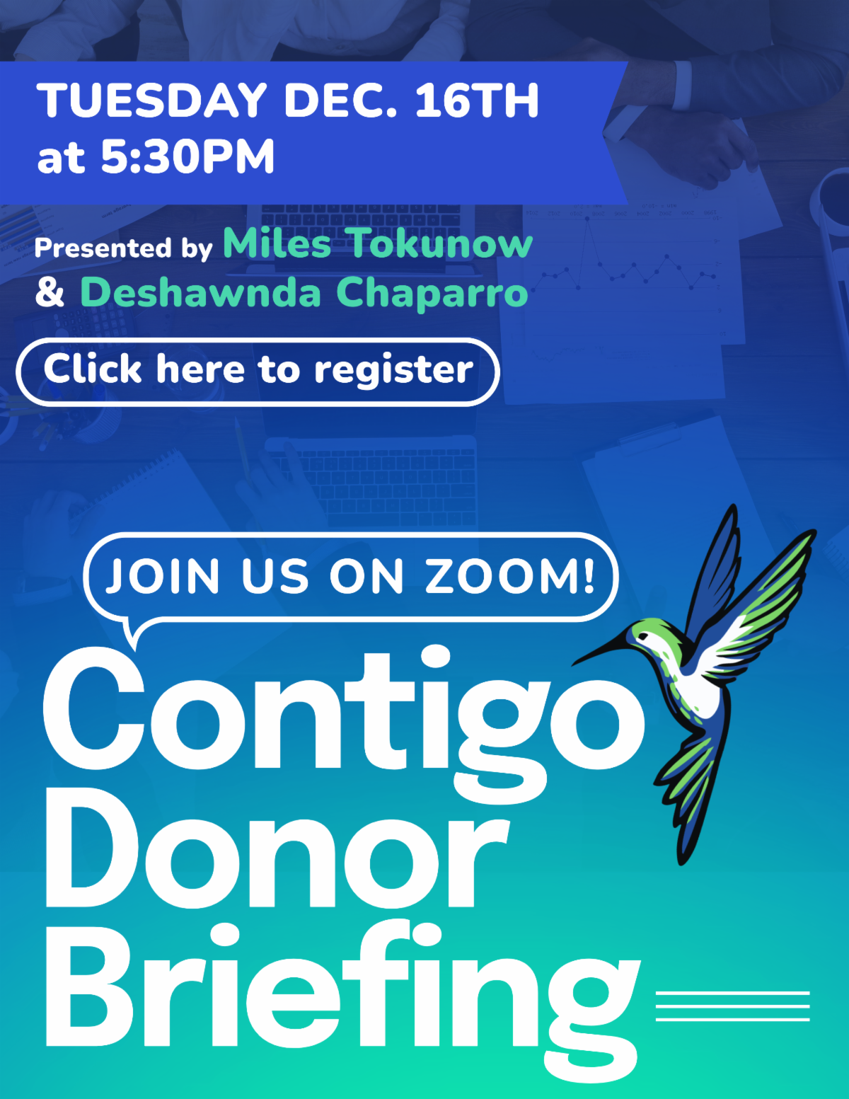 Join us for a special donor briefing Tuesday December 16th at 5:30 with Executive Director Miles Tokunow and Legal Director Deshawnda Chaparro, where they will share critical updates on the current landscape for immigrant communities and Contigo’s work at this pivotal moment. They will offer an inside look at our legal services and how community support is expanding our ability to protect families across New Mexico. This is a chance to hear directly from the leaders guiding our response, ask questions, and learn how your partnership strengthens safety, dignity, and freedom for the people we serve. We hope you will join us. |