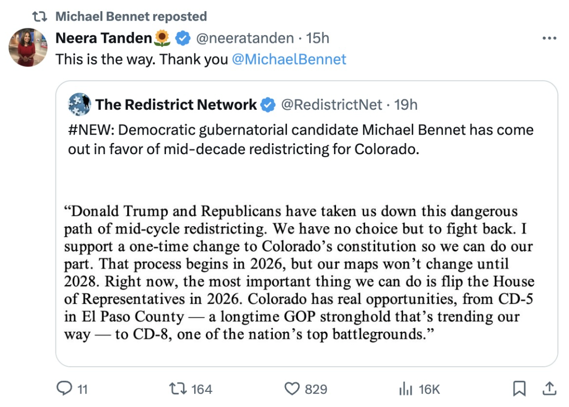 Senator Bennet now joins Colorado Attorney General Phil Weiser, Congressman Jason Crow, Secretary of State Jena Griswold, and countless other Colorado elected officials who are coming out in droves in support of the effort to redistrict Colorado.