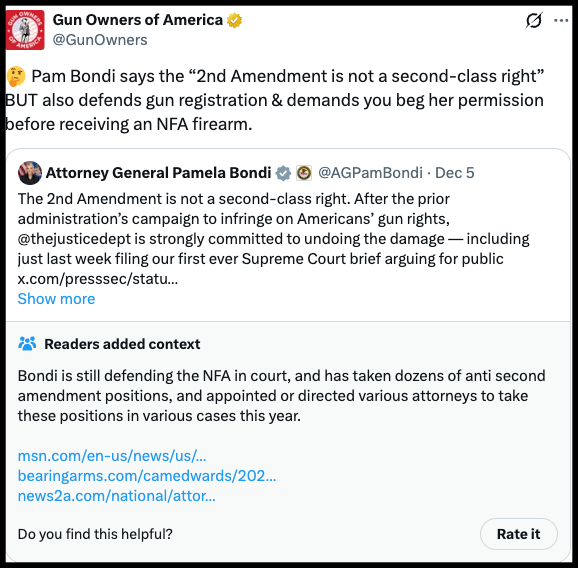 But when it comes to one of the most unconstitutional laws still on the books, the National Firearms Act, Bondi is doing the opposite of defending your freedoms. Bondi’s DOJ is actively defending the NFA in court, standing behind a law that forces gun registration, restricts access to commonly owned firearms and accessories, and has been used for decades as a tool of federal overreach. |