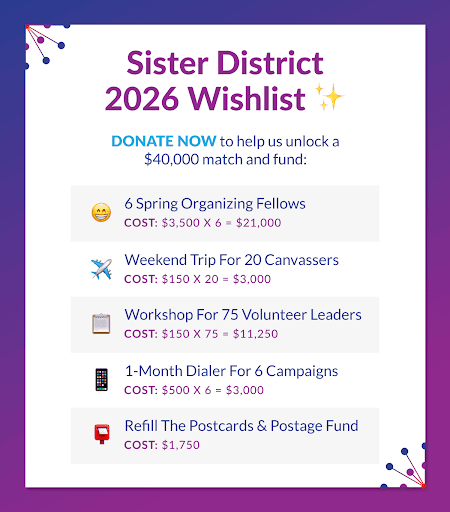 We put together our Sister District Holiday Wishlist, a collection of tools and early investments in our candidates and volunteers that will power our 2026 work.