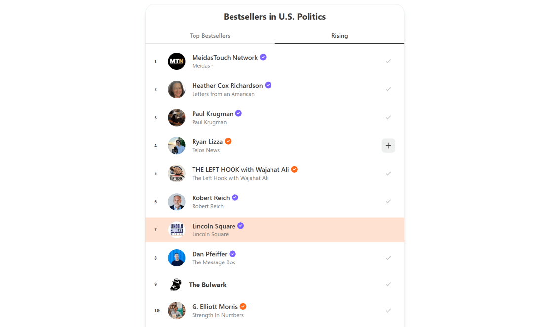 Dear Friend, Thank you for being an active, free subscriber. By subscribing, you’ve helped Lincoln Square become one of the fastest-growing pro-democracy communities on Substack! Just take a look for yourself, Lincoln Square is currently #7 on the bestsellers chart! Since we launched in March, we’ve shared nearly 90% of our insights for free, making our analysis a vital resource for everyone. But as the stakes rise and the 2026 midterms approach, the time to bring in the revenue we need to amplify our pro-democracy work to defeat the MAGA media machine and inform voters with the facts. We Are Winning.The recent election results swinging blue are clear evidence: the pro-democracy community—you—is making a massive difference. You are part of a movement that is pushing back against the forces seeking to dismantle our democratic institutions. But here is the sobering truth: we cannot take these wins for granted. The fight for democracy is a year-round campaign against a powerful, well-funded machine. They have billions of dollars and a sophisticated media apparatus designed to spread disinformation. We, the defenders of democracy, don’t have those billions. We only have each other. Your Upgrade is the Ammunition We NeedTo fuel this growth and ensure we can continue to deliver the high-caliber strategy you rely on, some of our most sought-after features are becoming exclusive to paid subscribers. Your upgrade isn’t just a subscription; it is an immediate investment in four critical, year-round strategies: