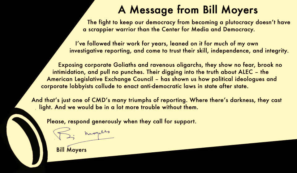 Dear John, For decades, Bill Moyers stood out as one of America's most steadfast champions of bold and insightful journalism. He was a national treasure — one we sadly lost last June at age 91. I feel deeply honored to have had the opportunity to work with Bill when I was at Common Cause, and for his steadfast support for the Center for Media and Democracy (CMD). Bill always understood that democracy cannot function in darkness. His work cast light on the powerful forces shaping public life with a rare combination of moral conviction, bravery, and intellectual honesty. Many of you may remember that for many years at this time, Bill graciously let us send out the message below praising CMD’s work and asking for your support. Here it is, one last time: | |