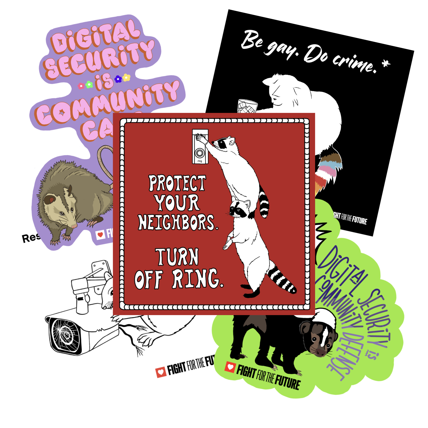 In 2023, I created a “Resist Surveillance Squirrel” design with the team, and since then we’ve added 4 more critter designs to the series. (In addition to creative-types, we also happen to identify with ungovernable animals.) These designs are available together in a sticker pack for the first time, including the newest design “Turn Off Ring Raccoons.”