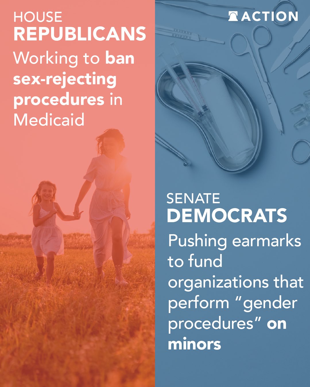 The Heritage Action-backed Do No Harm in Medicaid Act (H.R. 498) prevents Medicaid funds from funding sex-rejecting procedures on minors. This is the continuation of Republican efforts to stop taxpayers from funding these harmful drugs and irreversibly damaging surgeries. The Senate should immediately take up and pass this legislation.