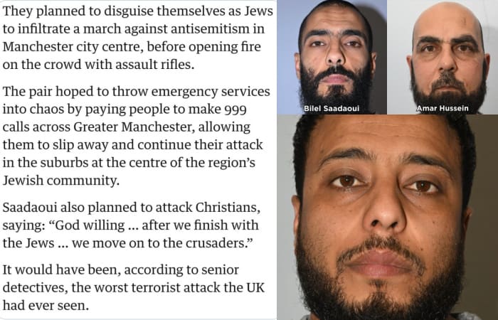 The terrible horrible details of the foiled yesterday Islamic attack on Jews in the UK:. They planned to disguise themselves as Jews to infiltrate a march against anti semitism in Manchester City Center, before opening fire on the crowd with assault ...
