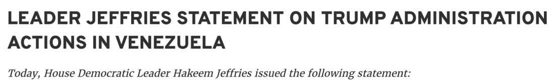 Anyone Spot A Difference There Besides EVERYTHING?Where Moulton leads from a position of strength going straight after Trump, defining him as corrupt, a criminal, and a liar, Jeffries goes straight for…Maduro. Telling us how bad a dude Maduro is right in the lede. Like he’s insecure and needs to justify he’s his opposition to Trump’s tyranny by also saying “but I don’t like him either!” There’s an old saying in politics: If you’re explaining you’re losing. And Jeffries is explaining like a MFer. Where Moulton defines the Don the Dingo’s actions in the harshest terms—criminal, dishonest, corrupt; refers to Marco Rubio as a “snake” and “liar,”—Jeffries…asks Trump questions. Really, this was the best he and his people could or would do. Our dictator just attacked a sovereign nation and killed 100 people, many of whom were civilians, without meeting his constitutional duty to share it with, and seek counsel from, Congress. Oh, I’m sorry, he’s made that partisan too. He told MAGA chuds like Tom Cotton. Just not Democrats, as Rep. Jim Himes pointed out he was left in the dark. So war is now partisan too. Back to Jeffries, who’s asking him how many troops will stay on the ground and whether this is about oil…as if he’ll answer your questions, and if he does, it’ll be honest? Is this real?? I know you are too smart not to know who this man is, so you must know you’ll get nothing. In other words, you sent out a form letter to check a box but actually offer nothing of any political, legal, or constitutional value. Let me put it this way: are you kidding me? In Jeffries’ rhetoric, there is no sentence such as: “your actions are illegal, but what should we expect from a lifetime con man, convicted felon, the man most responsible for the January 6th coup attempt, per prosecutor Jack Smith.” Instead we get: