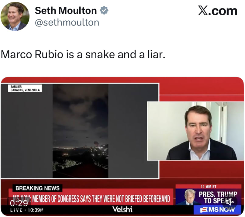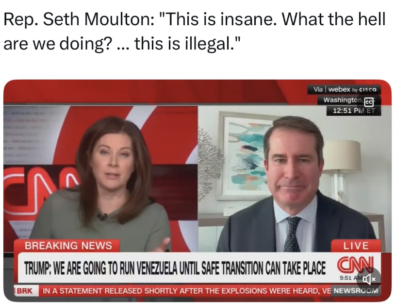 This is the message we must take into the 2026 election if we want an FDR-like blowout that turns out the Democratic base, even those who haven’t voted in years, wins over a chunk of the Republican vote, and overwhelmingly cleans up among independents. So who’s hitting the right note and taking the correct tack in responding to Trump’s dictatorial attack on Venezuela? Let’s see what Seth Moulton’s saying. Then take a look at House “Leader,” Hakeem Jeffries. Here’s Rep. Moulton: