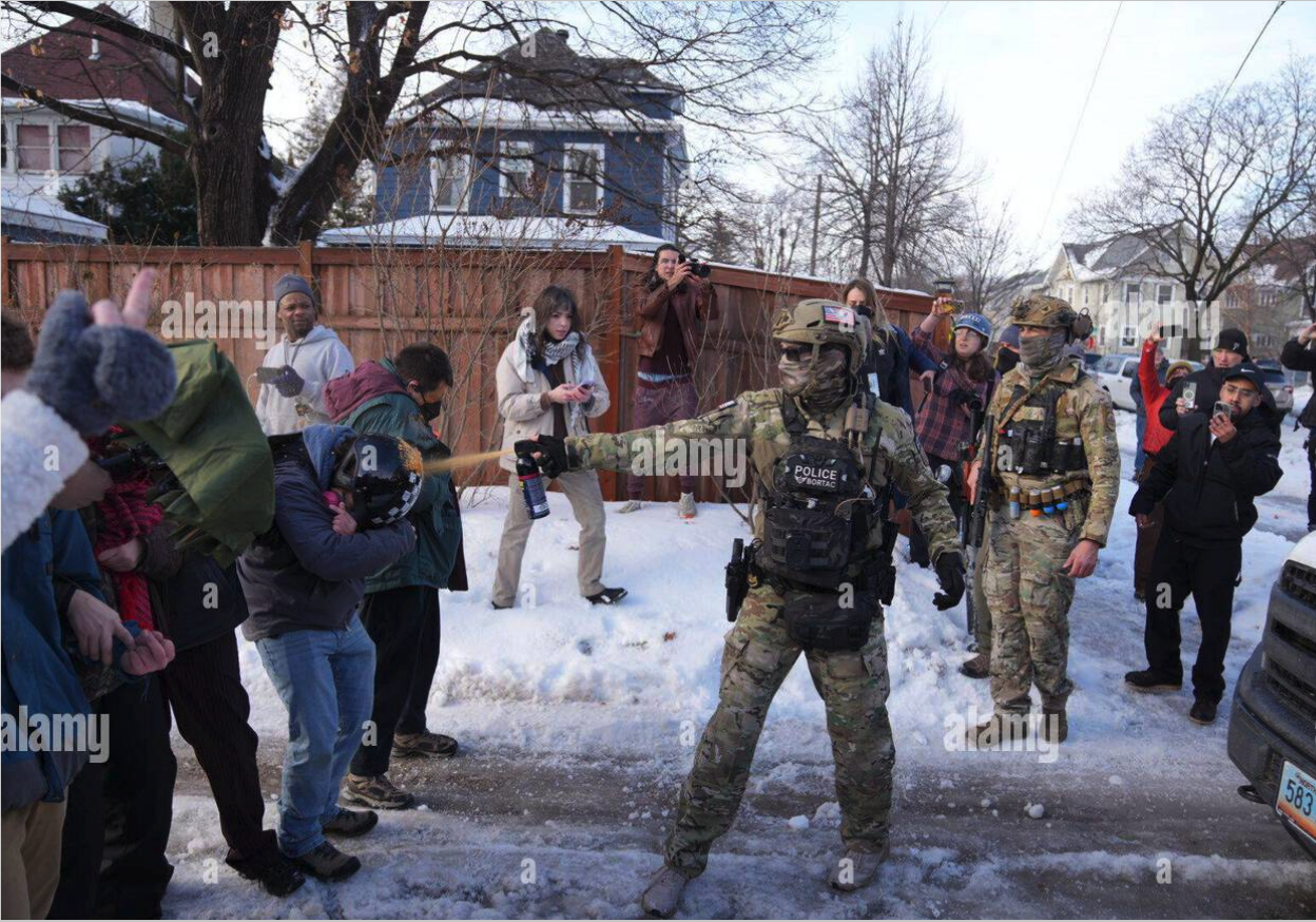 protestors with chemical spray scene of a shooting in Minneapolis, on