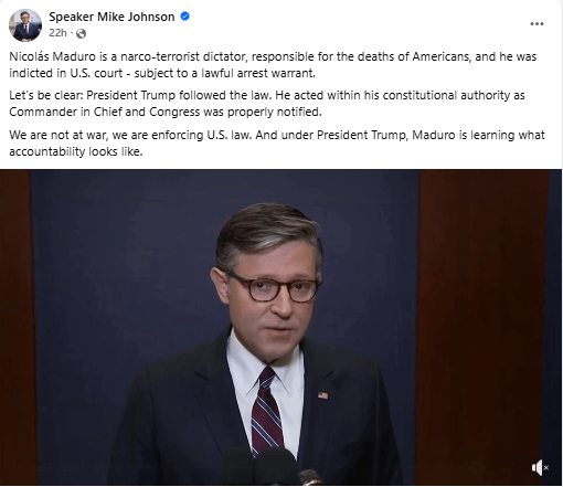 Notes from the Office of Speaker Mike Johnson Hello, friends! Thank you for subscribing to the Office of Speaker Johnson's newsletter highlighting what's happening on Capitol Hill and in Louisiana's 4th Congressional District. | On Wednesday, at the first weekly House Republican Leadership press conference of 2026, Speaker Johnson discussed the House Republican kickoff policy summit, Congressional Democrats in disarray over the ousting of Nicolás Maduro, and the constitutionality of the Trump Administration’s successful actions in Venezuela. Speaker Johnson also addressed the tragic passing of Congressman Doug LaMalfa. Click the image below to watch Speaker Johnson's remarks. | Following the capture of Venezuela's dictator Nicolás Maduro, Speaker Johnson delivered remarks on the successful, lawful operation. Speaker Johnson said, "The world is safer because Maduro is apprehended and in the hands of the U.S. justice system now." | This week, Speaker Johnson issued his formal invitation to President Trump to deliver the State of the Union on February 24. House Republicans look forward to President Trump's address to the nation. | On Tuesday morning, Speaker Johnson's friend and colleague Rep. Doug LaMalfa (CA-01) passed away at the age of 65. Rep. LaMalfa was a lifelong resident of northern California and deeply loved its people. Following the news of his passing, Speaker Johnson said, "He was as fierce of a fighter for his state’s vast natural resources and beauty as we have ever known. We are mourning the loss of our friend and brother today and we send our respects for his life and work to his wife Jill and the LaMalfa family during this difficult time." Many of his colleagues considered him "the kindest man" that they have ever known. Click the image below for more. | GREAT news: the U.S. trade deficit fell to its lowest level since 2009. President Trump’s trade agenda is delivering real results: exports are up, imports are down, and American workers are finally getting a fair shake. | On Thursday in the U.S. Capitol, Speaker Johnson visited with Ahmed Al-Ahmed, the hero who stopped the terrorist attack in Australia on the first night of Hanukkah. Antisemitism must always be confronted and defeated wherever it appears, and we continue to pray for those affected by the horrific Bondi Beach attack. | This week, Speaker Johnson joined The Scott Jennings Show to discuss the capture of Nicolás Maduro and Republicans' agenda for 2026. Click the image to watch, and check our YouTube channel for more. | In December, Speaker Johnson met with local community leaders at the Cyber Innovation Center and the Greater Bossier Economic Development Foundation to discuss how House Republicans' work in Washington can strengthen the Shreveport-Bossier economy, support our military bases like Barksdale AFB, and protect the strong values of north Louisiana. Additionally, Speaker Johnson attended the Independence Bowl to cheer on the Louisiana Tech Bulldogs to victory. | Speaker Johnson is honored and proud to represent the great people of Louisiana's 4th Congressional District. He is always grateful for your support. Never hesitate to reach out. Thank you for reading, | Office of Speaker Mike Johnson | Sign up for Speaker Johnson's newsletter to get updates from Washington! | Bossier City 2250 Hospital Drive Suite 248 Bossier City, LA 71111 (318) 840-0309 | Washington, D.C. 521 Cannon House Office Building Washington, DC 20515 (202) 225-2777 | Northwestern State University - Ft. Polk Mailing: P.O. Box 779 Leesville, LA 71496 (337) 423-4232 | DeRidder Mailing: P.O. Box 160 DeRidder, LA 70634 (337) 226-6385 | Ruston 401 N. Trenton St. Ruston, LA 712070 (318) 497-6610 | |