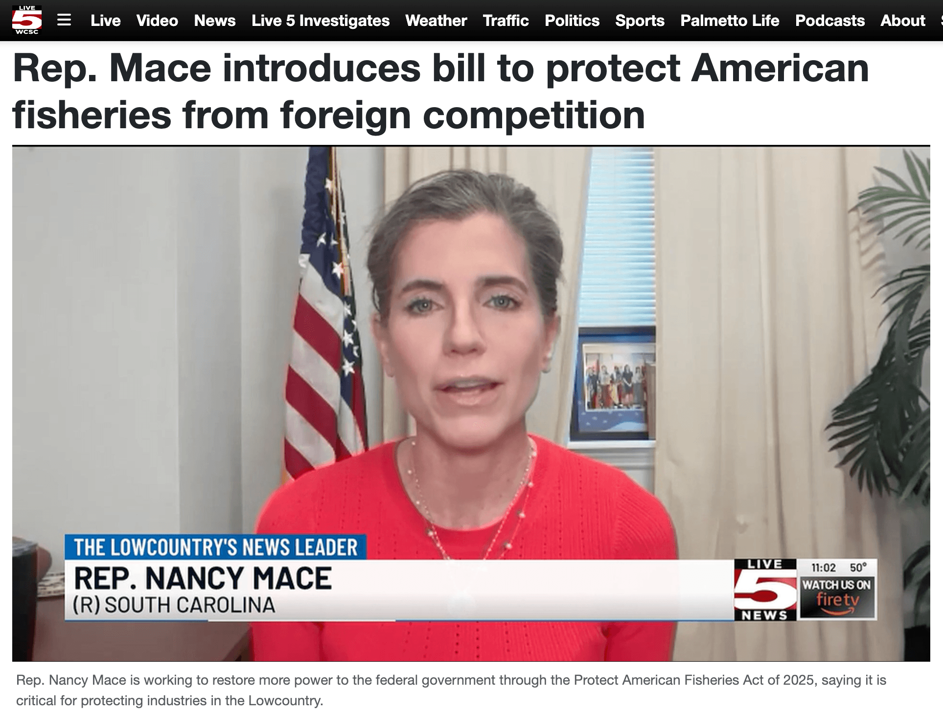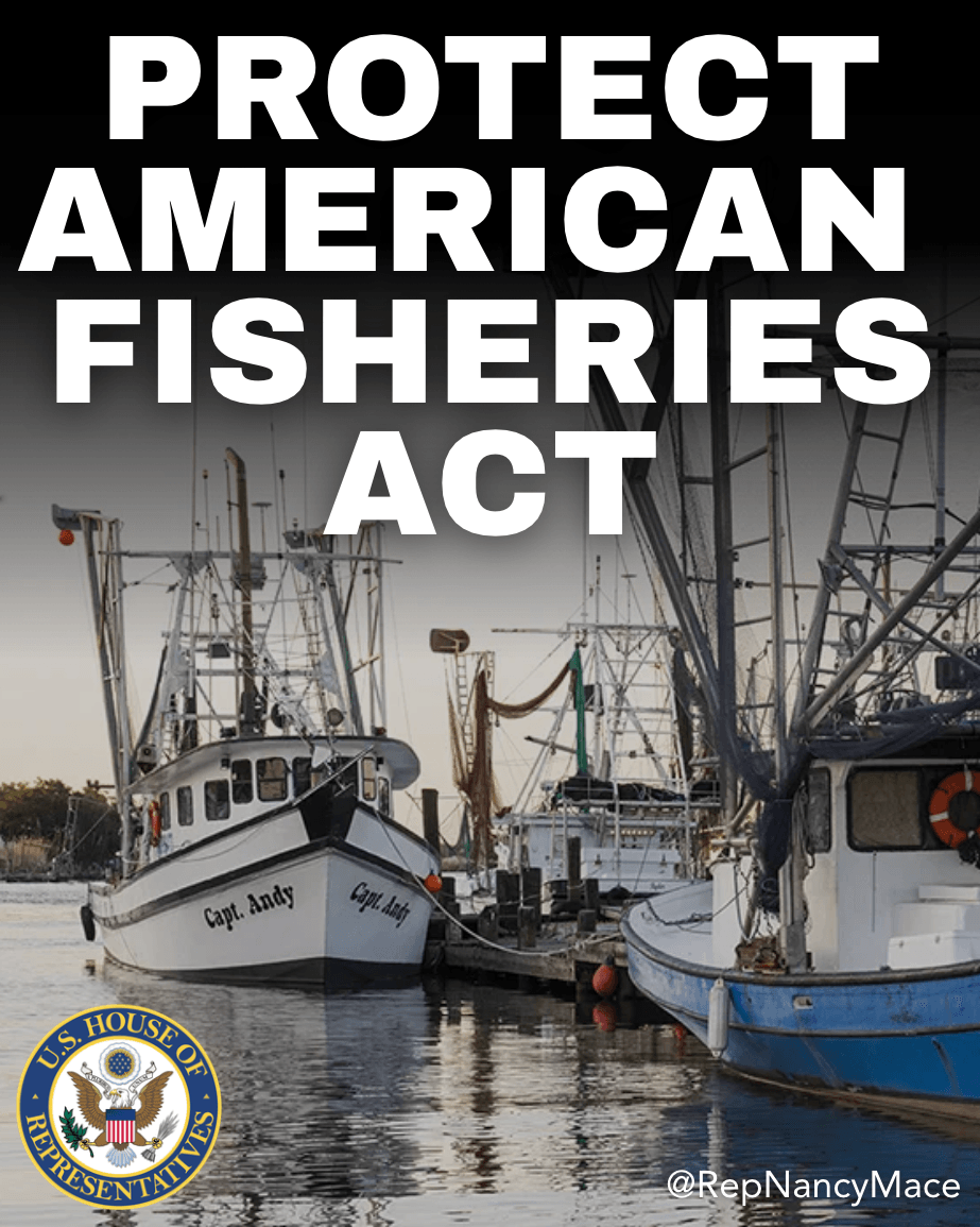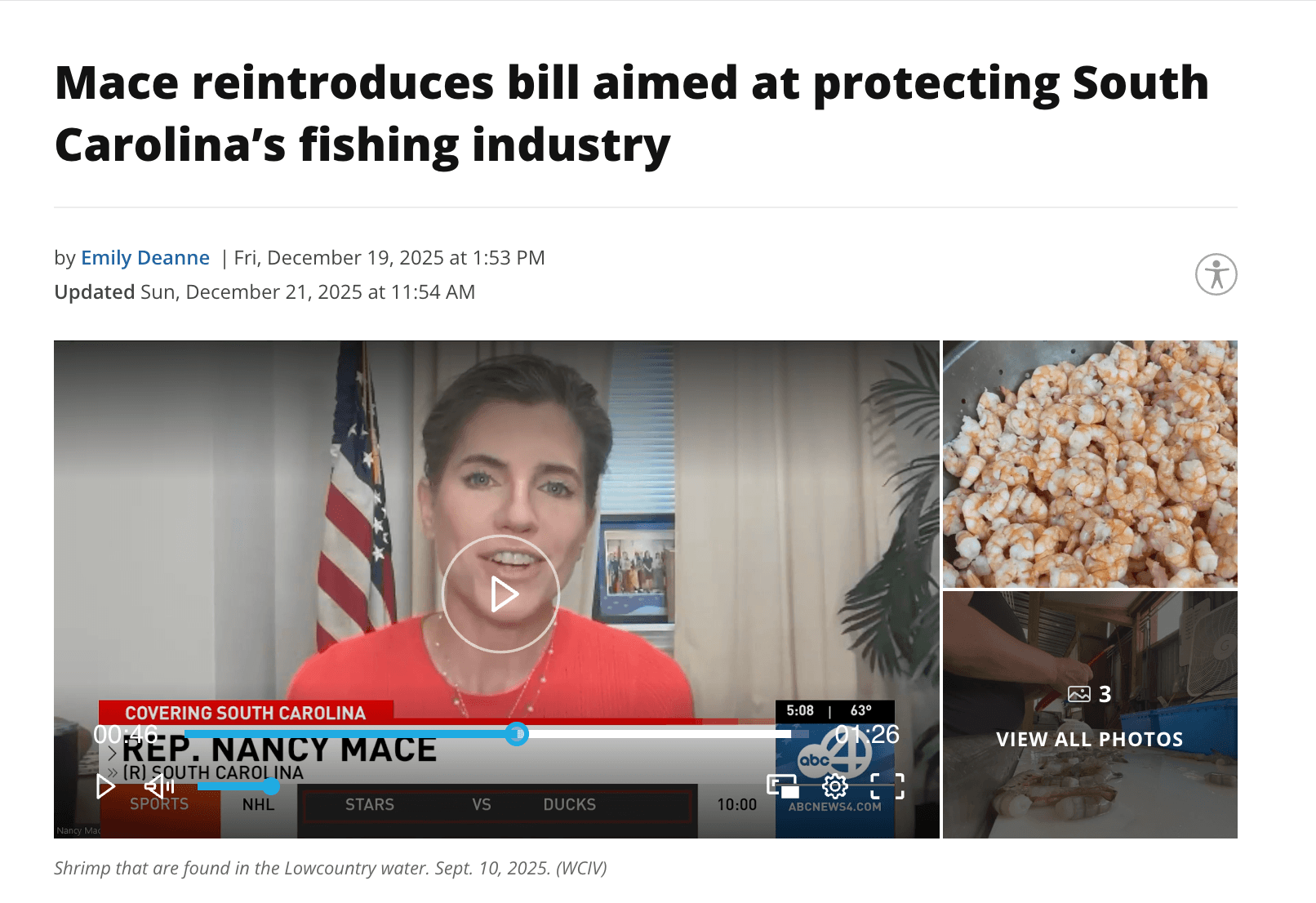 Committee Work Two of our bills, the Skills-Based Federal Contracting Act (H.R. 5235) and the Veterans Affairs Distributed Ledger Innovation Act (H.R. 3455), passed out of committee and await floor consideration. No one works harder to put South Carolina FIRST. | INTRODUCING: The Preventing Prosecutors from Protecting Predators Act to hold soft-on-crime prosecutors accountable when they take federal dollars but refuse to protect women and children. Across America, prosecutors are declining to prosecute rapists, child abusers, and sex traffickers, allowing predators to walk free to victimize even more Americans. If prosecutors take federal funds meant to protect victims, this bill REQUIRES them to report how serious cases are handled. And if they refuse or decline to prosecute more than half of these cases, they lose funding. As a survivor, this is personal. Victims deserve justice. Families deserve safety. Taxpayers deserve accountability. Do your job, or lose your funding. Read more about the bill HERE. | INTRODUCING: The Protect American Fisheries Act to strengthen protections for U.S. fisheries and coastal communities against foreign interference and illegal fishing. Foreign dumping and anticompetitive practices have pushed American fishermen to the brink, and the entire industry knows it. President Trump’s executive order restoring American seafood competitiveness set the standard, and we’re building on it with overwhelming support from shrimpers and fishermen nationwide. From South Carolina to New England to the Gulf Coast, fishermen are living the consequences of predatory foreign practices every single day. We’re strengthening federal law so economic harm caused by foreign actors finally triggers disaster relief and delivers real protection for America’s working watermen. Below are South Carolina fishermen and industry leaders from across the country who have expressed strong support for our bill: “This is a common-sense bill that provides a critical support to our industry when we need it most. Our fishermen are some of the hardest working small business owners in the country, and they shouldn't be forced out of business because of the actions of bad actors on the other side of the world. We wholeheartedly support Congresswoman Mace in her fight to get this bill passed and signed into law. To support this bill is to support the preservation and continuity of the American Dream,” said Rocky Magwood, President of the South Carolina Shrimpers Association. “Fishermen are, by nature, a community that comes to the aid of anyone in trouble on the water. This bill isn't a handout, but a lifeline for our industry when we find ourselves in stormy economic seas. It’s a matter of economic justice, and we appreciate Congresswoman Mace for her tireless efforts to support the American seafood industry,” said Bryan Jones, Vice President of the South Carolina Shrimpers Association. “When we lose our fishing industry to unethically produced supply chains, we lose our food security. Representative Mace understands that supporting American fishermen in a crisis means protecting America’s ability to feed itself. We’re grateful she’s fighting for our food independence and the hardworking families that support coastal economies by sustainably harvesting wild-caught shrimp,” said John Williams, Executive Director of the Southern Shrimp Alliance. "No other U.S. fishery has suffered greater harm from having to compete in the U.S. market with illegal and unfairly traded imports than the Atlantic pelagic longline fishery. NOAA needs to recognize that the failure to effectively enforce U.S. trade laws has enabled imports from IUU fisheries, through the abhorrent use of forced labor, and with the benefit of foreign government subsidies, to continue to enter our market placing our fishermen at a severe competitive disadvantage. It's become a total disaster for our fishery. We really need help and thankfully, Rep. Mace's bill would provide it,” said Marty Scanlon, President of the Blue Water Fishermen's Association. "Currently the only way fishermen and seafood support businesses can get disaster relief assistance is when there is a resource disaster. While this is important and valuable to the industry when there is a resource collapse, there is no assistance available in the event of an infrastructure or market related disaster. The hurricane that devastated the industry in southwest Florida did not qualify because the resource was intact but the whole harvesting infrastructure was destroyed. Likewise, the shrimp resource in the southeast USA is robust, however, the market price has collapsed due to over importation of farm-raised shrimp, typically below the cost to produce. More shrimp was imported over the last few years than this country can consume. This leaves the wild-caught, American shrimp industry very little market space at prices too low to cover the expense to harvest. This is a fisheries disaster created by unregulated importation but does not qualify for fisheries disaster funding. We need to protect American seafood food producers for the people of the United States or we will have no domestic food to choose from,” said Mike Merrifield, President, Southeastern Fisheries Association. "For far too long domestic seafood producers have been harmed by the anti-competitive practices of foreign interests, the Protect American Fisheries Act of 2025 is a timely lifeline to level the playing field for fishermen providing wild, American seafood to the public,” said Ryan Bradley, Director, Mississippi Commercial Fisheries United, Inc. “This bill aims at making the fishery disaster determination process more comprehensive and helps ensure the longevity of the seafood industry and the communities that it supports,” said Dave Donaldson, Executive Director, Gulf States Marine Fisheries Commission. "NOAA's fishery disaster program must finally come to terms with the reality
