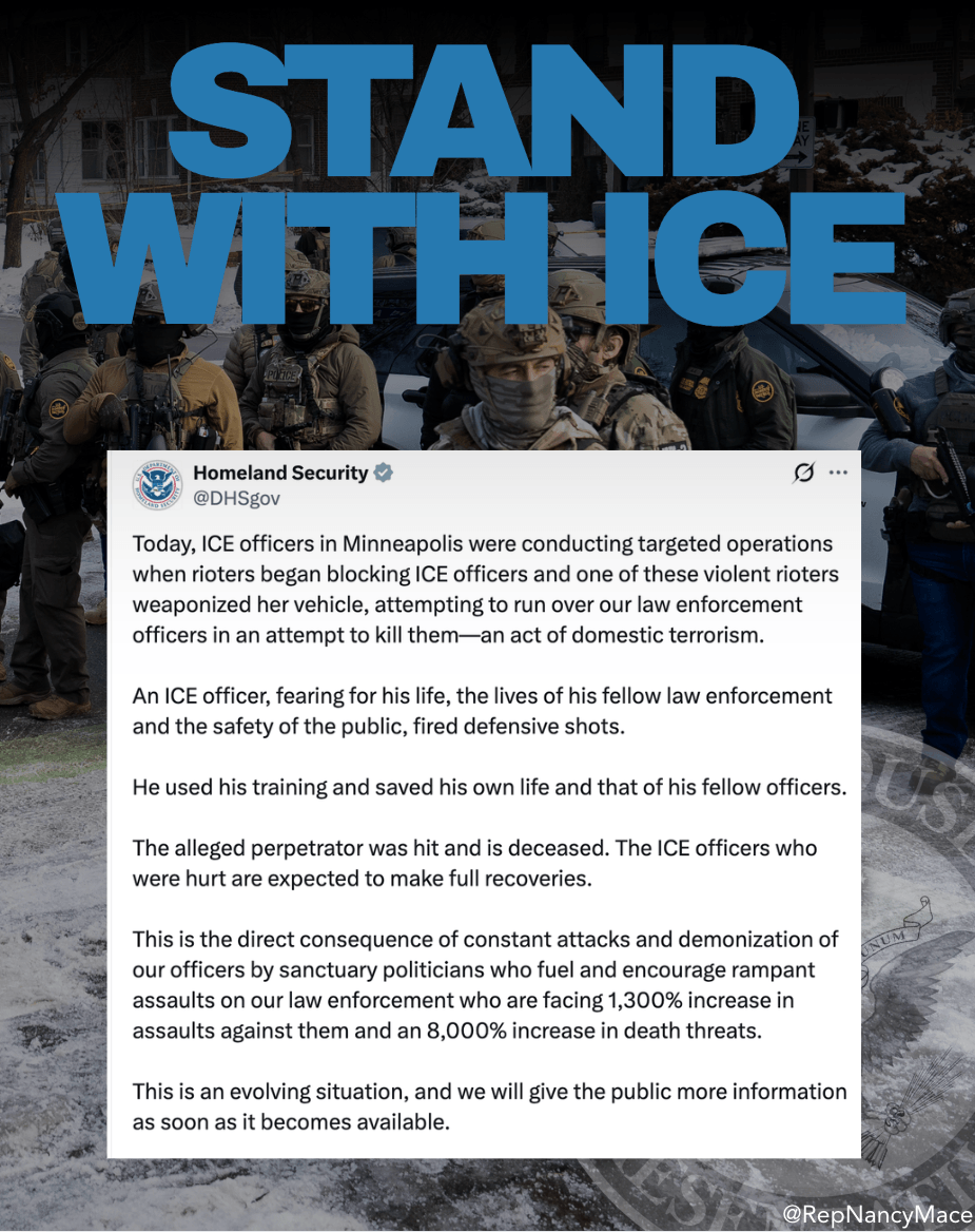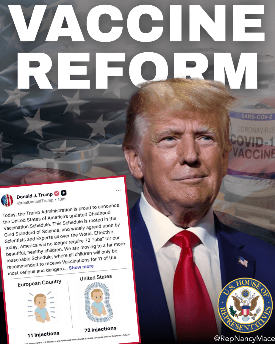 Witness testimony confirmed millions of dollars in fraudulently obtained funds were routed overseas, including to Al-Shabaab, a U.S.-designated Foreign Terrorist Organization affiliated with al-Qaeda. “Democrats on this Committee would rather shout at witnesses than confront the truth,” said Congresswoman Mace. “Minnesota fraud is Democrat fraud. And the refusal to subpoena basic records looks less like oversight and more like a cover-up.” The Oversight Committee’s investigation into Minnesota fraud remains ongoing. Watch our full remarks HERE. | During the Oversight Committee hearing examining fraud in Minnesota, we moved to subpoena immigration records related to Representative Ilhan Omar and her brother-husband. Our motion sought immigration records necessary to determine whether federal laws were violated in connection with Omar's immigration and marital history. The motion was tabled by both Democrats and Republicans on the Committee. “Democrats and Republicans teamed up to kill our motion to subpoena the records,” said Congresswoman Mace. “Washington did what it always does, protect its own. The American people are sick of backroom deals and selective accountability.” Public reporting has raised serious allegations Rep. Omar entered into a legal marriage in 2009 with a man she had privately identified as her brother, allegedly for the purpose of securing lawful immigration status. Reports also indicate she entered into a religious marriage in 2002 which was not legally dissolved until years later. “If these allegations are true, they raise grave concerns involving potential marriage fraud, immigration fraud, and violations of federal and state law,” Mace continued. “No one, no matter how politically protected, should be above the law.” | Congresswoman Mace released the statement below applauding President Trump and the United States military for its successful operation in capturing Venezuelan President Nicolás Maduro: “President Trump took bold and decisive action today. His brilliant decision to have the brave members of our War department execute a dramatic operation to seize international narco terrorist Nicolás Maduro has made America safer and stronger than ever. "President Trump has once again shown the world what a strong, well led America can do: strike anywhere, any time, against its enemies. "The Dictator Maduro thought he could peddle drugs into America and support terrorists, but President Trump showed him otherwise. "I am so proud of President Trump, Secretary Hegseth, the men and women of the War Department, and our law enforcement officers who all worked together flawlessly to bring Maduro and his wife to the US to face justice." | Congresswoman Mace commented on the Minnesota ICE shooting below: "This was an act of domestic terrorism. "ICE officers were attacked during a lawful operation, and one officer was forced to fire defensive shots to survive. Responsibility lies with politicians who incite hatred against law enforcement and then act shocked when violence follows. "ICE agents now face a 1,300 percent increase in assaults and an 8,000 percent increase in death threats, fueled by the Left’s pro-criminal policies that turn officers into targets. "Law enforcement deserves our full support." | Congresswoman Mace released the statement below in support of President Trump's updated Childhood Vaccination Schedule: "President Trump is putting American children first by aligning our childhood vaccine schedule with international standards used across Europe. For too long, our children have been subjected to 72 jabs, far more than any other developed nation, and parents have had legitimate concerns that have, for years, been dismissed.” This new schedule focuses on the 11 most serious and dangerous diseases while restoring parental rights and medical freedom. European countries have thrived with similar schedules, and there's no reason American children need to be treated differently. Parents, not bureaucrats or pharmaceutical companies, should have the final say in their children's healthcare decisions. This reform empowers families to work with their doctors to make informed choices without government mandates. The previous system was excessive, and many parents felt bullied into compliance. President Trump is returning sanity and science-based policy to childhood healthcare. “As the mom of a child who had a vaccine reaction at 18 months, and who has had one herself from the COVID jab, our family welcomes this modification, for all children." | Weekly Report from Congresswoman Nancy Mace CONSTITUENT SERVICES Our casework team is currently managing 539 active cases, helping residents navigate federal bureaucracy at agencies including the IRS, Department of Veterans Affairs, and U.S. Citizenship and Immigration Services. To date, our office has returned more than $37.7 million directly to constituents owed money by the federal government. IN THE DISTRICT Our team completed over a dozen events, meetings, and site visits across the Lowcountry, including meetings with Johns Island developers, Bluffton constituents, and calls with Joint Base Charleston leadership. We also attended the NOAA Change of Command ceremony, the Beaufort County Veterans Affairs Council meeting, and the Charleston Chamber's Legislative Reception. We also met with Chief Creel of the Edisto Kusso Tribe, the South Carolina Office of Resiliency, and development teams working on the Dorchester Heritage Center's new facility, a project expected to generate over $52.3 million in economic impact over ten years. FEDERAL FUNDING & LOCAL PROJECTS We submitted a letter of support for the Dorchester Heritage Center's new facility project to the U.S. Department of the Treasury's New Market Tax Credit program for $2.3 million. This project would create jobs and serve over 25,000 students in poverty. Charleston was awarded a Safe Streets for All grant through the Department of Tr