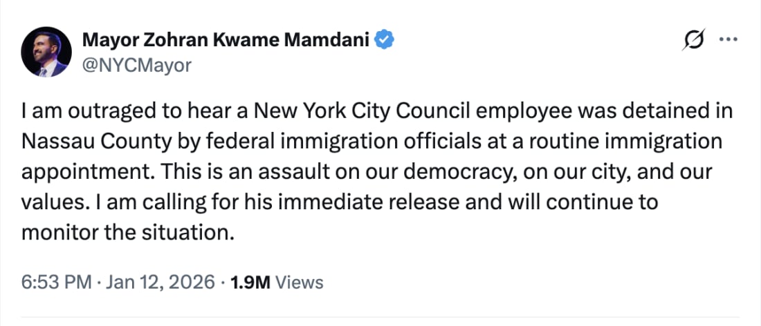 Mamdani fires back at DHS after NYC Council employee detained at immigration appointmentThe Department of Homeland Security detained Rafael Andres Rubio Bohorquez, 53, a New York City Council employee working as a data analyst, during an immigration appointment Monday in Nassau County, with DHS saying the migrant overstayed a 2017 tourist visa and was arrested in an assault case, prompting Mayor Zohran Mamdani to call it “an assault on our democracy, on our city, and our values” and demand his immediate release.