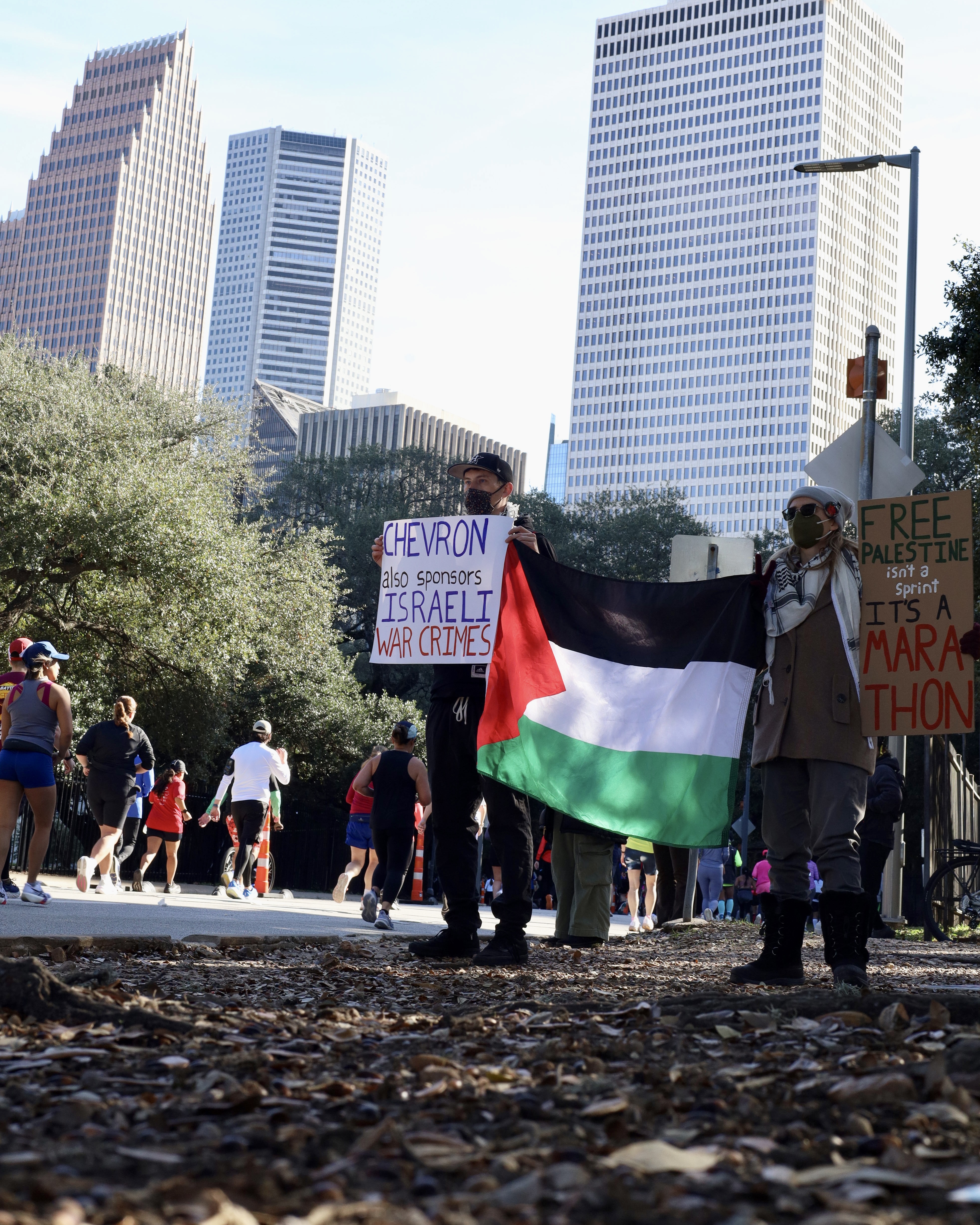 Last week, our Stop Fueling Genocide campaign protested the Chevron Houston Marathon. There we had spread our message of boycotting Chevron and had positive interactions with runners. Our banner was even briefly seen in the ESPN and Channel 13 coverage of the frontrunners!