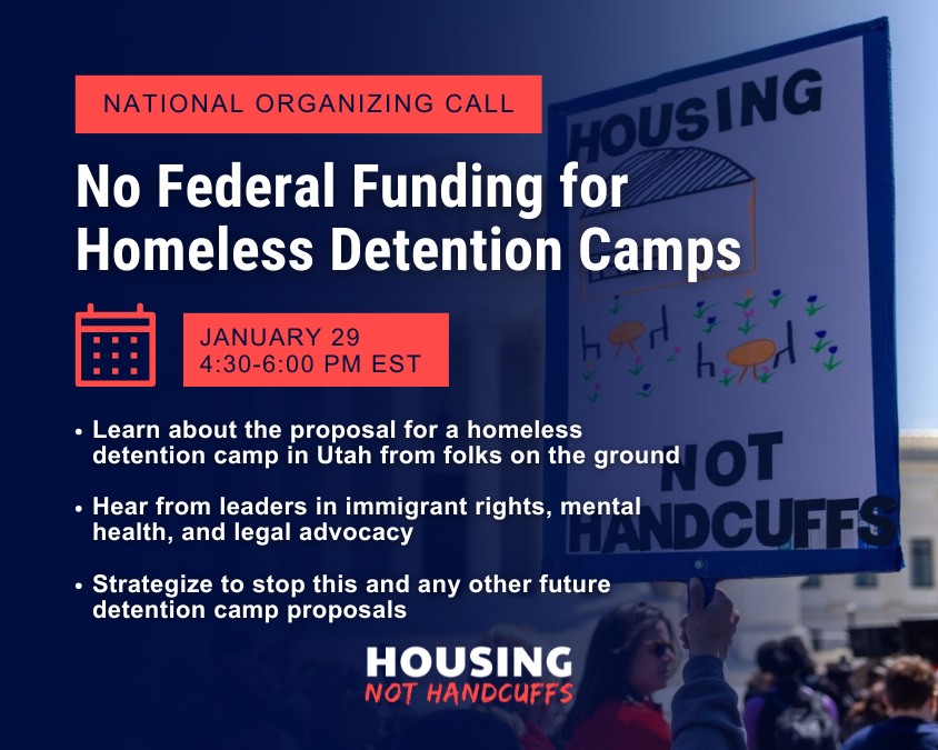 We're fighting back by launching the No Federal Funding for Homeless Detention Camps campaign and calling on people from across the country to join us. On January 29 at 4:30–6:00 PM ET, we’ll host a national webinar to unpack what’s happening in Utah, examine the federal funding implications, understand the impacts our unhoused neighbors, and outline how advocates can take coordinated action to stop this proposal before it spreads to other states.