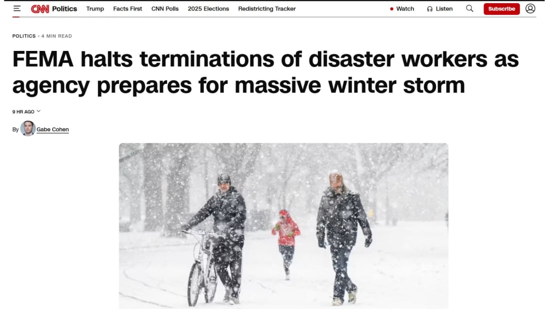 The Cold Is Brutal. FEMA’s Failure Will Be Worse.As millions face record lows, Trump and Kristi Noem’s “efficiency” experiment leaves Americans to freezeBy David Shuster The United States is now facing a winter storm of almost biblical proportions: ten days of iron-cold temperatures in some areas flirting with minus 50, trees exploding like artillery shells, power lines collapsing in frozen tangles, and deep snow burying more than a dozen states, including large swaths of the South that regard sleet as a theological mystery. Some 180 million Americans may feel the bite. Nature, never daunted by our civic arrangements or emergency stockpiles, is coming to collect. But the storm itself is only the opening act. The real horror will arrive when we witness the machinery of government supposedly designed to respond. State and local governments—already worn down by years of overlapping calamities, hollow budgets, and chronic exhaustion—are stretched thin. And looming above this brittle structure is FEMA, the Federal Emergency Management Agency, that great alphabet relic Americans are supposed to trust when the lights go out and the heat dies. Today, under Donald Trump and DHS Secretary Kristi Noem, FEMA resembles less a rescue agency than a badly managed charity raffle staffed by ghosts. Once upon a time, FEMA’s purpose was clear: coordinate disaster response, marshal federal resources, and prevent citizens from freezing to death in the rubble of their own bad luck. Now, FEMA is an agency that has been gutted by Trump/DOGE budget cuts, staff purges, and administrative malpractice—presided over by political leadership that regards emergency preparedness as an optional hobby. Consider North Carolina, where the wounds from 2024’s Hurricane Helene remain fresh. According to multiple local reports, FEMA evicted residents from temporary housing earlier than promised—some as recently as this week—despite these residents having nowhere else to go. This, mind you, as snow, ice, and freezing rain threaten prolonged power outages. If the goal was to demonstrate a talent for cruelty at precisely the wrong moment, the agency succeeded. Across the country, the story is the same. Over the past year, the Trump administration closed dozens of FEMA offices and dismissed hundreds of staff. Trump, Elon Musk, and Kristi Noem did this in the name of “efficiency,” that beloved corporate euphemism that actually means, “fewer people doing more work until nothing functions.” The very employees who would normally be planning, staging, and coordinating disaster response were sent packing, leaving entire regions to face catastrophe with little more than crossed fingers. Now, at the last possible moment, Department of Homeland Security Secretary Kristi Noem has ordered a halt to the termination of disaster workers, extending contracts that were allowed to expire in the first place. The headlines are unintentionally comic: FEMA halts termination of disaster workers as agency prepares for massive winter storm. An internal email obtained by CNN instructed staff to “cease offboarding” disaster workers whose contracts were expiring—a process that had been cheerfully underway since early January. But reality, that rude intruder, refuses to cooperate. Roughly 300 disaster workers have already been let go this month, with only a handful rehired. Current and former FEMA employees confirm what common sense already knows: the agency is not prepared. This sudden reversal is not leadership. It is panic. Disasters, unfortunately, are not mitigated by ideological experiments, management theories, or last-minute political theater. Responding to a massive storm requires competence, people power, and foresight—qualities in short supply in the Trump administration, where agencies are run as if government itself is the enemy. When Americans are left shivering in the dark, Trump and Noem's explanations about budget discipline will not provide warmth or comfort. So, as the cold descends and the power grid groans, our nation is once again confronting an uncomfortable truth: the deep snow, unrelenting ice, and subzero temperatures may be ferocious, but the failure to adequately prepare and respond will be almost entirely the fault of the Trump administration. And when FEMA falters—as it surely will—the blame will not belong to the blizzards, the wind, or the indifferent laws of physics. It will belong to the Trump team idiots who mistook destruction for efficiency, ideology for governance, and last-minute reversals for competence—and who will now force the suffering public to pay the price, one frozen night at a time. Read More Blue Amp MediaDive into our latest coverage — from the killing of Alex Pretti and what actionable steps we can take now, to a sharp comparison of Mark Carney and Donald Trump’s contrasting visions at Davos. You're currently a free subscriber to Blue Amp Media. For the full experience, upgrade your subscription. |