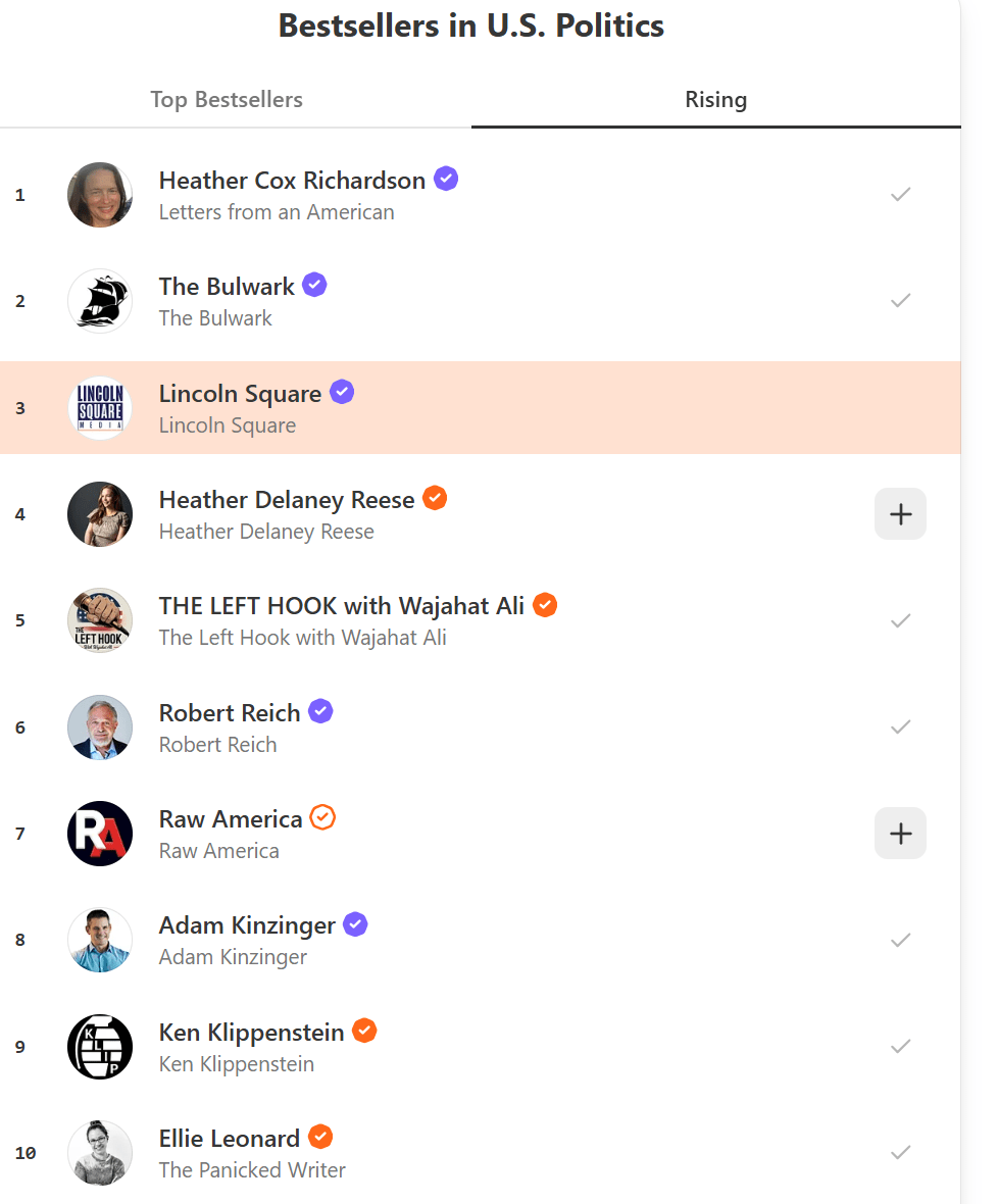 Lincoln Square: The Independent AlternativeThey want to shut us up. They want to shut us down. But at Lincoln Square, we are refusing to play their game. We are an independent, reader-supported defense against this war on the facts. We don’t answer to tech oligarchs or federal “marketing” budgets—we answer to you. But to keep “turning up the volume” on the truth and reaching the millions of Americans being fed a diet of disinformation, we need to fortify our operations. Our lowest rate of the year. Cancel any time. A Call to Arms: Lock In 50% Off Our Regular Rate Forever.To show this regime that they cannot suppress independent media, we are launching a massive push to upgrade our free community to paid supporters. If you upgrade by midnight tonight, we will lock in this rate for the life of your subscription. Your rate will never increase, no matter how much they try to squeeze independent media. Your support funds the expert commentary, and rapid-response analysis and commentary that the mainstream media is now too afraid to touch. They want to exhaust us. But we need to use this attack and onslaught of chaos to rally us. We won’t tire out, we won’t give up. We’re ready to fight. Don’t let the “MAGA Media” and federal censors decide what you’re allowed to know. Help us keep the lights on and the truth loud. With gratitude and defiance, The Lincoln Square Team P.S. Because of your support, Lincoln Square has hit the Top 10 Rising Substack charts three times this week alone—and a staggering 100 times since we launched last March. We are deeply honored that our mission resonates with you. Your engagement is the fuel that keeps this engine running; let’s keep climbing. |