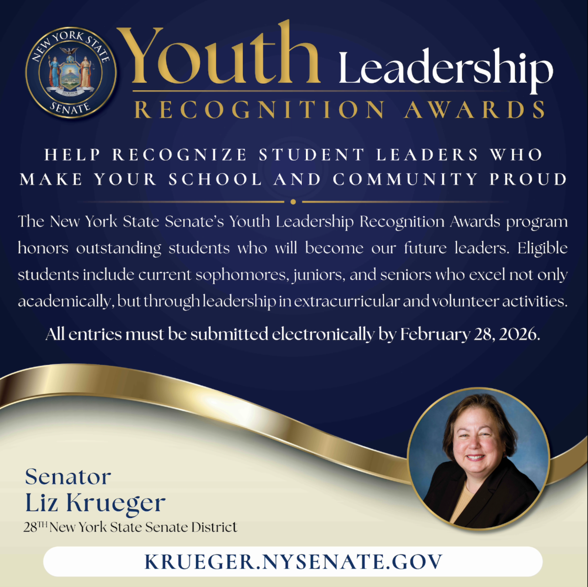 The New York State Senate’s Youth Leadership Recognition Award program honors outstanding students who will become our future leaders. Eligible students include current sophomores, juniors, and seniors who excel not only academically, but through leadership in extracurricular and volunteer activities. Students selected to receive the New York State Senate Youth Leadership Recognition Award will receive a congratulatory personalized certificate from their Senator.