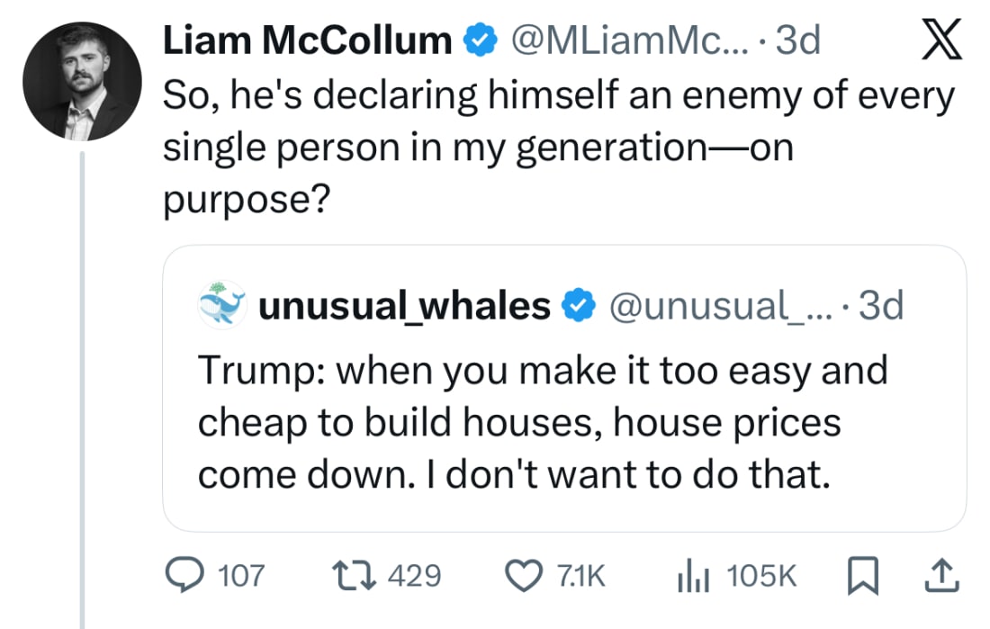 The second reason I’m watching this is that I’m running for Congress to make things better for our state and nation. To do that, I have to win (something too few Democrats have realized over the last decade). I recognize this frontal cultural attack as a magnifying glass on a long line of lived disappointments that are creating the conditions for electoral change in ‘26, and it can’t come soon enough. Swing and Republican voters are souring on the GOP. The 2A attack is a loud cultural accelerator, lending credibility to the dozens of other Republican wounds that have been inflicted on voters. What follows are just a few of those injuries. Out here on the campaign trail, it’s nearly impossible to find someone whose healthcare situation is anything but dire. Even Republican voters are screaming “uncle”, and they remember Trump’s emphatic, repeated, and broken campaign promises to dramatically lower costs, blow up the insurance system, and make healthcare great again. No one here is experiencing any greatness; in fact, it’s getting much worse. Many Montanans have lost coverage due to ACA and Medicaid cuts, or seen their premiums skyrocket, and voters are rightfully scared and pissed off about it. Montana is under the cost-of-living gun gun too because our prices for just about everything are painfully high. This, despite Trump’s emphatic promise, “Starting on day one, we will end inflation and make America affordable again, to bring down the prices of all goods.”² In fact, the Trump- and GOP-supported tariffs have made things much worse in Montana. Agriculture has been hit hard, and many businesses here are struggling due to the resulting high prices or the dramatic decline in Canadian tourism.³ (Gosh, who could have guessed insulting, threatening, and tariffing our neighbor would result in the equivalent of a big maple leaf middle finger?) Instead of helping anywhere, Trump seems intent on pouring even more gas on the betrayals. Here in Montana, housing affordability is at a crisis level, the worst in the nation.⁴ Working people, especially anyone under 35, simply cannot afford to buy a home. But Trump cannot even be bothered to feign concern. Earlier this week, he made it clear that he wants housing prices to INCREASE, not decrease.⁵