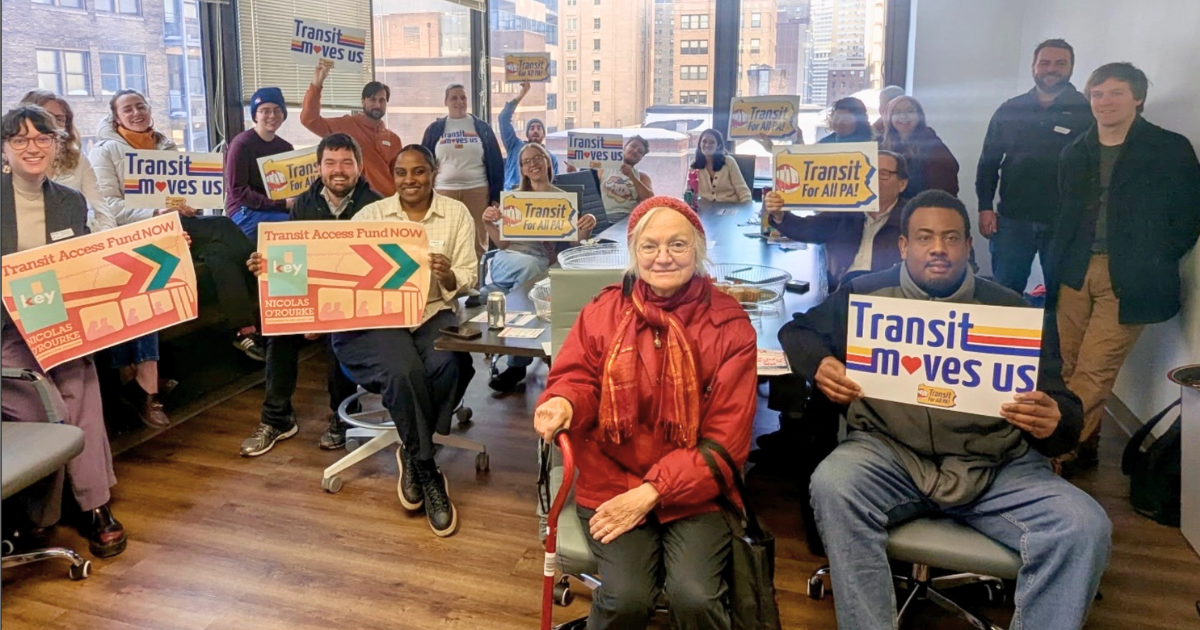 image description: supporters holding signs and logos for Transit for All PA!, Clean Air Council, PA Downtown Center, Pittsburghers for Public Transit and Transit Forward Philadelphia