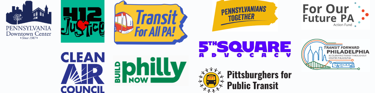 Transit for All PA! is a campaign led by Pittsburghers for Public Transit 5119 Penn Ave. Pittsburgh, PA 15224 United States Amalgamated Transit Union PA Joint Conference Board Philly Transit Riders Union Transit Forward Philadelphia 5th Square PA Downtown Center Bicycle Coalition of Greater Philadelphia Clean Air Council Pittsburghers For Public Transit