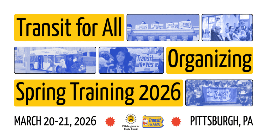 Image description: Black text highlighted in yellow reads “Transit for All Organizing Spring Training 2026”, interspersed with blue-filtered images of transit advocates at rallies, holding signs, and boarding the bus. Smaller text below reads “March 20-21, 2026, Pittsburgh, PA”, with the Pittsburghers for Public Transit and Transit for All PA logos.