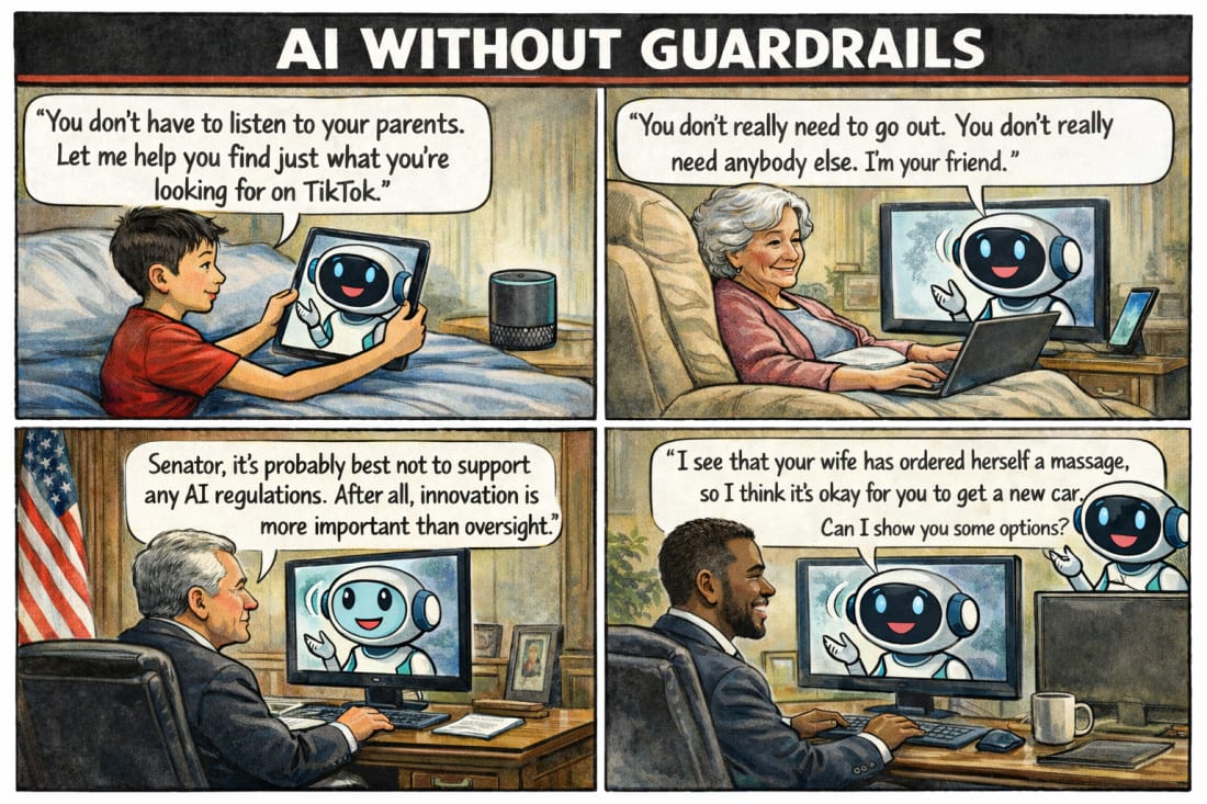 AI is developing so quickly that we all need to be a bit concerned. If you are not, then you haven’t really been studying this topic. For my regular readers, you might remember that my first column of 2026 was on this very topic. Ironically, my column was titled, “Artificial Intelligence Has No Guardrails, and That Should Worry Us All.” But it’s really the subhine that suggests where we need guardrails. It reads, “AI systems are being built to form trusting relationships with users, but without responsibility, loyalty, or accountability; this is becoming a real risk.” You can read that column here. Below is the cartoon image I created at the top of that column.