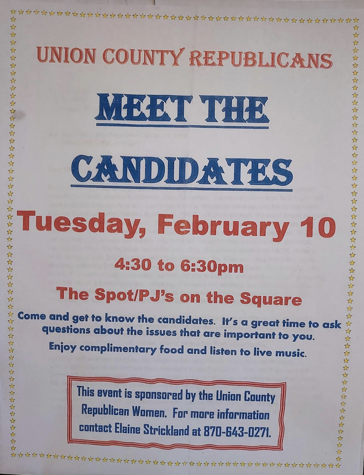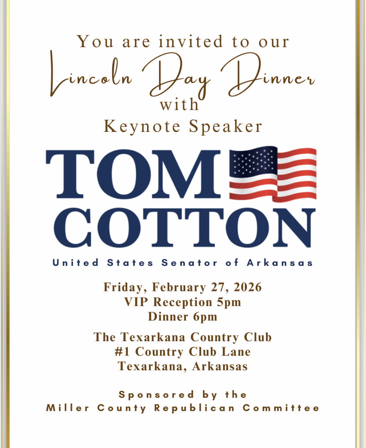 | | This email may be clipped. Click "view entire message" at the bottom of this email to view entire list | | Other Upcoming Happenings | | Independence County Republicans Reagan Rockefeller Dinner with U.S. Senator Tom Cotton | | Columbia County Republican Committee Reagan-Lincoln Dinner with U.S. Senator Tom Cotton | | Faulkner County Republican Party 3rd Annual Freedom Feast with Historian Bill Federer | | Union County Republicans Meet the Candidates | | Logan County GOP Lincoln Day Dinner | | Pulaski County Republican Women Luncheon with AR House Candidate Stephen Bright | | Sharp County Republican Party Candidate Meet and Greet | | Miller County Republican Committee Lincoln Day Dinner with U.S. Senator Tom Cotton | | | | |