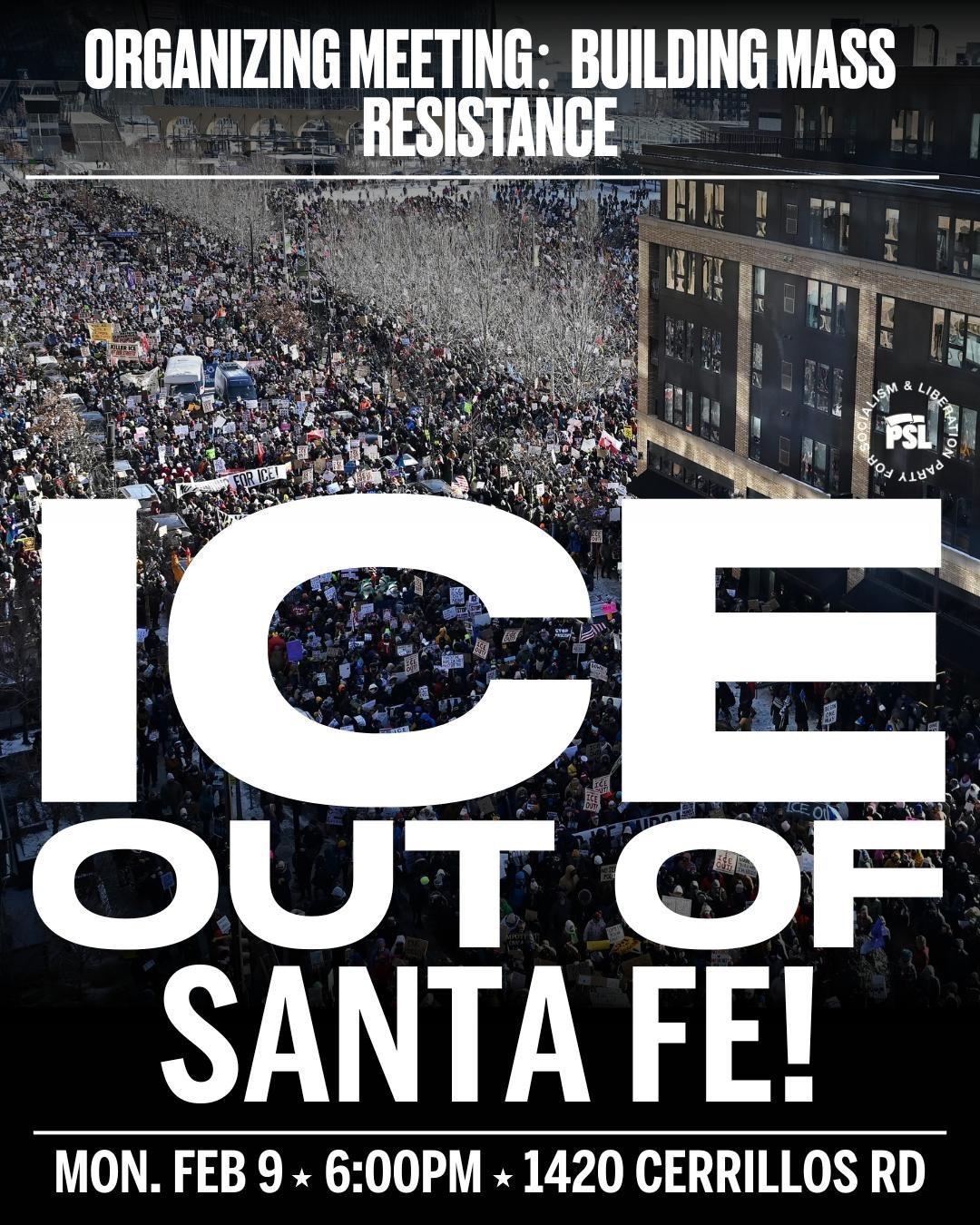 Santa Fe DSA is urging our friends and comrades to come out and learn how we can all help to protect our community from an ICE invasion. The event will be organized by the Party for Socialism and Liberation, and will be a good opportunity to meet and collaborate with other organizers to defend our community from ICE, as the people of Minneapolis have just bravely demonstrated. We hope to see you at 1420 Cerrillos Rd on February 9th at 6 pm.