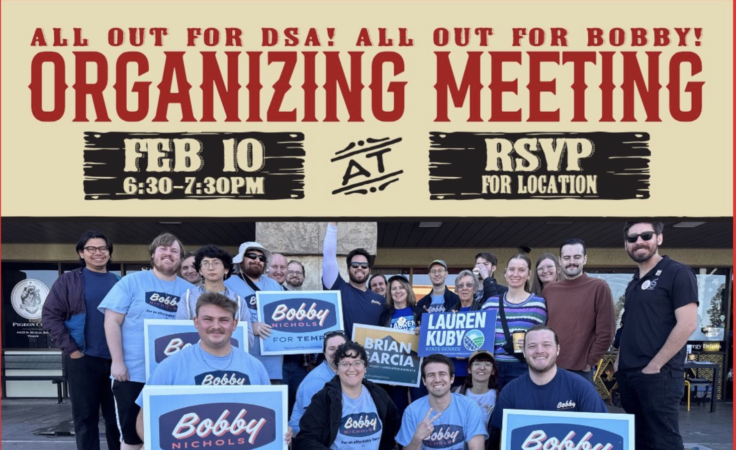 On Tuesday, February 10th, from 6:30–7:30 PM, we’re bringing together volunteers, neighbors, and supporters for an All Out for DSA! All Out for Bobby! Organizing Meeting.