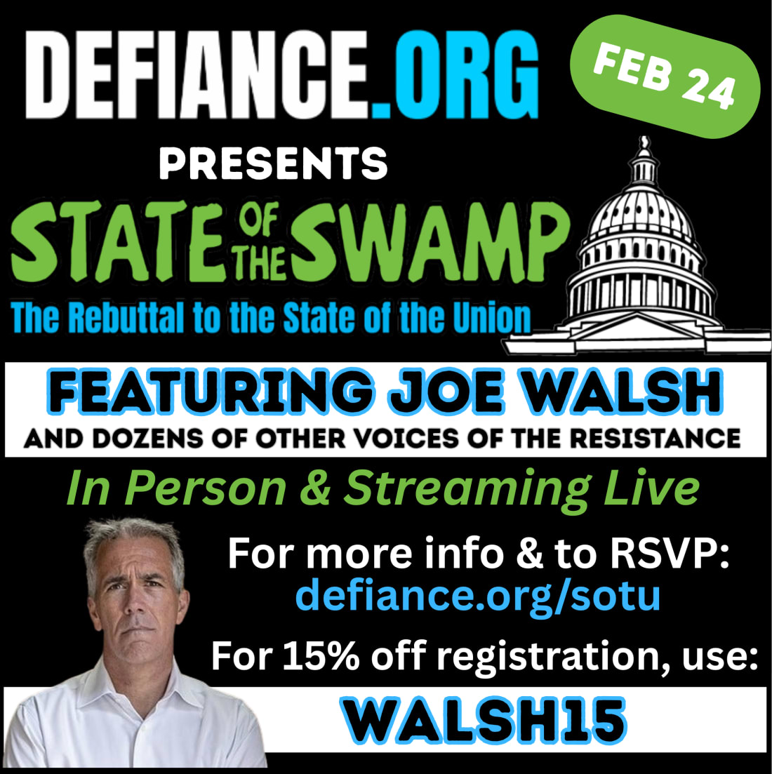 I’m excited to announce that DEFIANCE.org has invited me to speak at its STATE OF THE SWAMP event, the BIGGEST rebuttal to Donald Trump’s State of the Union address, on February 24, at 7pm ET—in person and streaming live from the National Press Club in Washington, D.C.