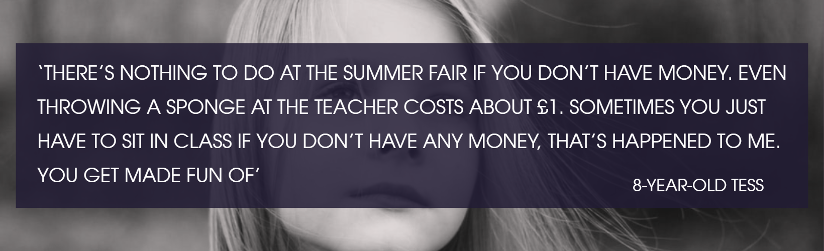 Currently, nine children in every classroom of 30 are living in poverty. This affects children’s experiences at school; from getting dressed in the morning to coming home and doing homework in the evening, families are faced with a range of extra costs that stem from parts of the school day. Not being able to meet these costs can lock children out from the opportunities and experiences readily taken up and enjoyed by others who can afford them.