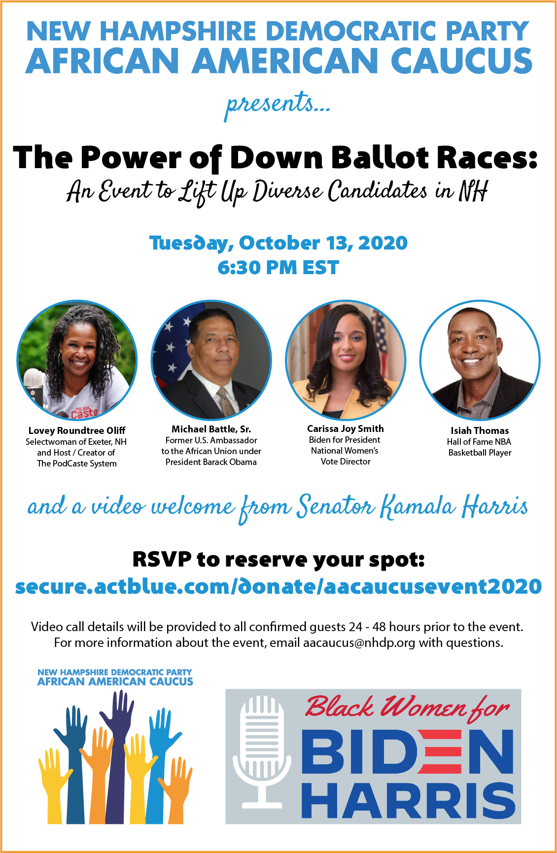 All of the money raised on Tuesday evening is going to be donated to diverse NH candidates in some of the most targeted down ballot races this year. In addition to the speakers listed on the flyer above, the NHDP African American Caucus are excited to welcome: