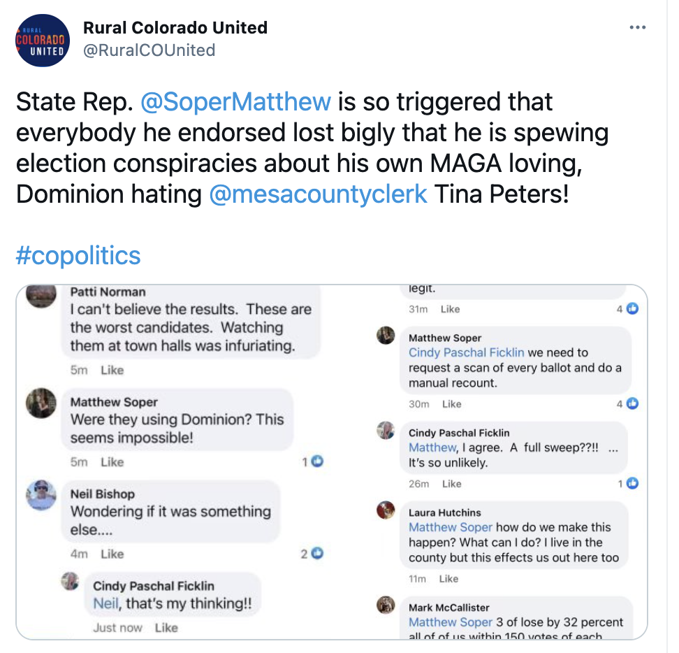 Last week, we wrote about the unhinged reaction on the part of a number of Western Slope Republicans, including up-and-coming wunderkind Rep. Matt Soper, to the results of city council elections in Grand Junction–in which a slate of GOP-endorsed candidates was soundly defeated by a bipartisan moderate coalition.