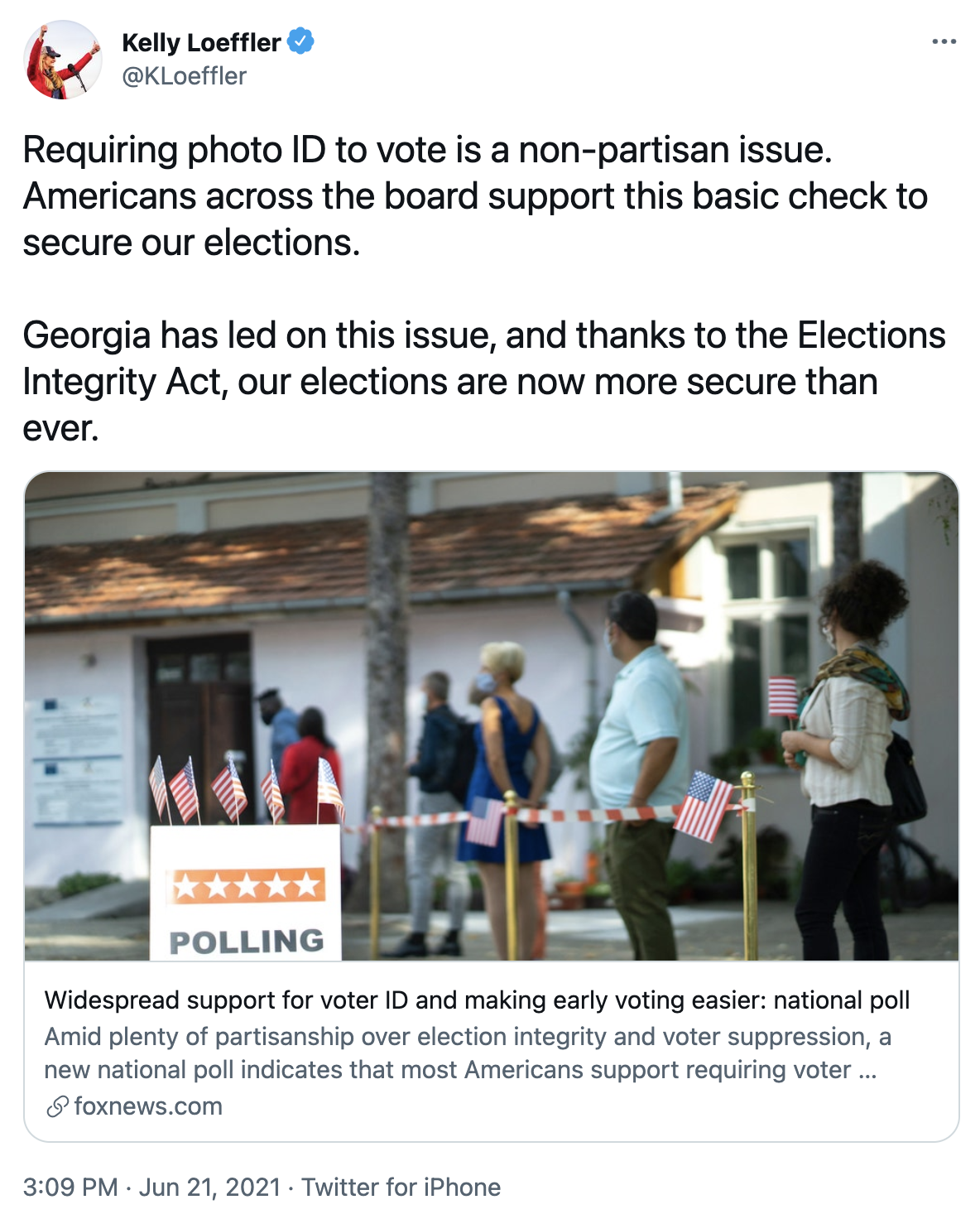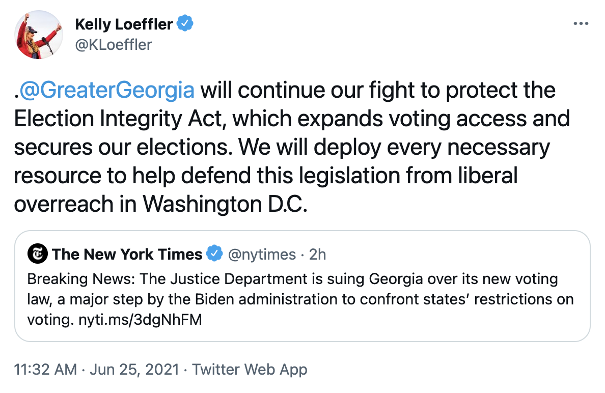 Chairwoman Kelly Loeffler issued a statement in response to the DOJ's suing Georgia over the Election Integrity Act (S.B. 202).