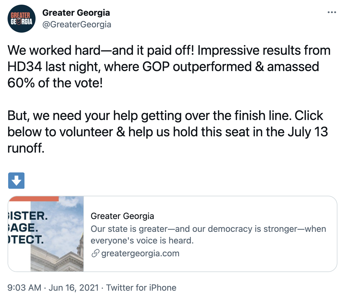 Greater Georgia held an event in Cobb County with HD34 volunteers to kick off the final stretch leading up to the runoff election on July 13