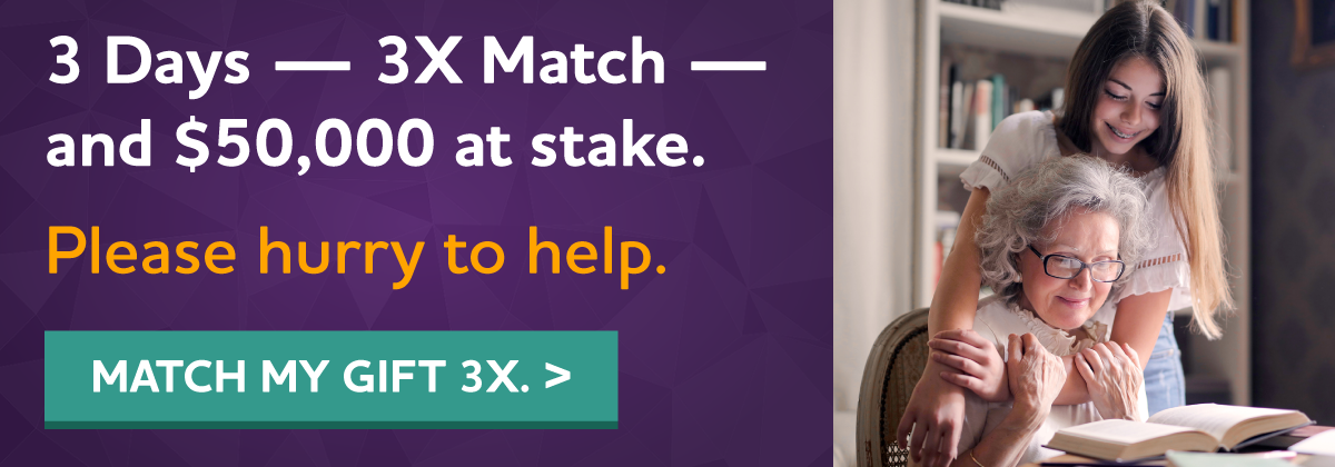With just three days of Alzheimer's & Brain Awareness Month left, an incredibly generous donor who wishes to remain anonymous is helping in a BIG way. This donor has pledged $50,000 and provided an opportunity to TRIPLE your impact when you make a gift to our $50,000 3-Day 3X Match Challenge, up to a total of $50,000. Please hurry though; there are only three days for you to be part of this amazing match challenge.