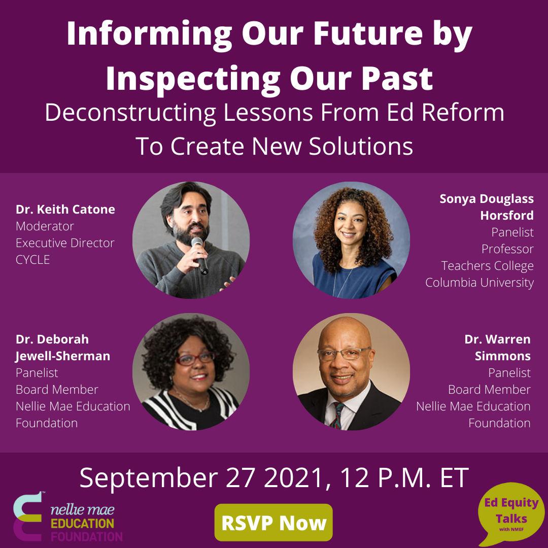 In this conversation, we’ll sit down with: Sonya Douglass Horsford, Professor at Teachers College, Columbia University; Dr. Deborah Jewell-Sherman, the Gregory R. Anrig Professor of Practice in educational leadership at the Harvard Graduate School of Education and NMEF Board member; and Dr. Warren Simmons, former director of the Annenberg Institute for School Reform at Brown University, and also a NMEF Board member. Dr. Keith Catone, Executive Director of CYCLE, will moderate. Learn more about this event and RSVP here.