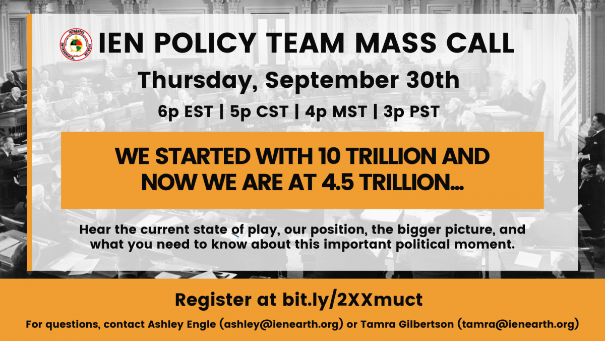 Join Indigenous Environmental Network this Thursday, September 30th, at 6 pm ET | 5 pm CST | 4 pm MST | 3 pm Pacific to hear the current state of play, our position, the bigger picture, and what you need to know about this important political moment.