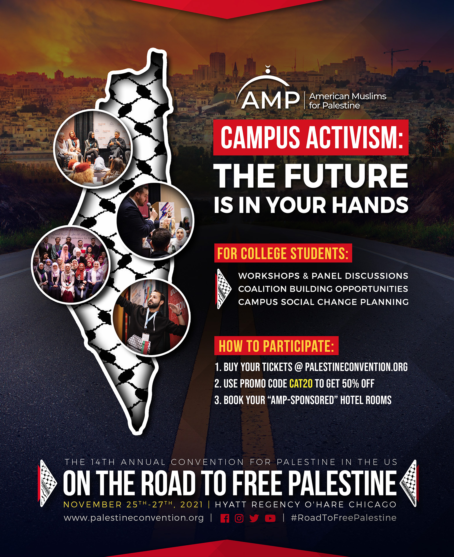 Participants can compete in one or more categories, and the winners will receive prizes! Click here to sign-up and learn more. If you know students who might be interested, please share this with them. 2. College Students! Be on the lookout for the Campus Activism Track (CAT) - a special session for college activists who are passionate about Palestine and want their voices heard. This year’s intensive series of workshops titled “Campus Activism: The Future is in Your Hands” will equip college activists with tools, resources, and the network needed to successfully fight for Palestinian rights on campus. Visit our website here to get your CAT tickets and find out about our special offer. |