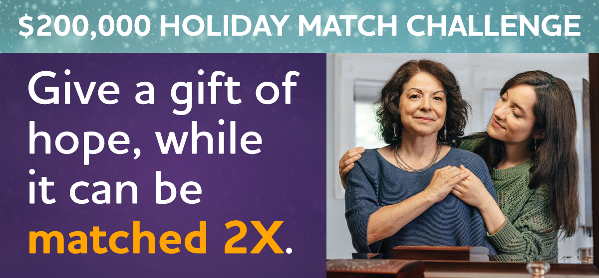By donating to our $200,000 Holiday Match Challenge today, you'll give help and hope to countless people affected by Alzheimer's this holiday season. Thank you.
