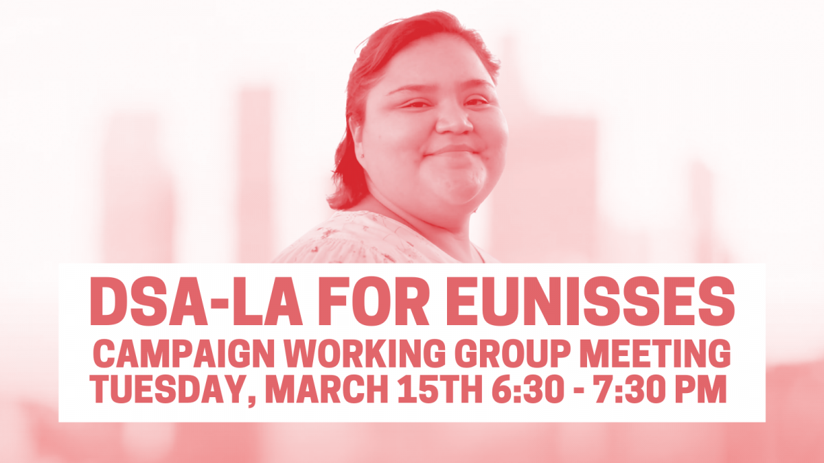 Join us for the next Eunisses Working Group Meeting! We will be debriefing our first canvass and discussing next steps to support her campaign. Come learn about opportunities for postcarding and canvassing, and help us outreach to DSA-LA members during the meeting! Sign up to RSVP and to receive the Zoom info.