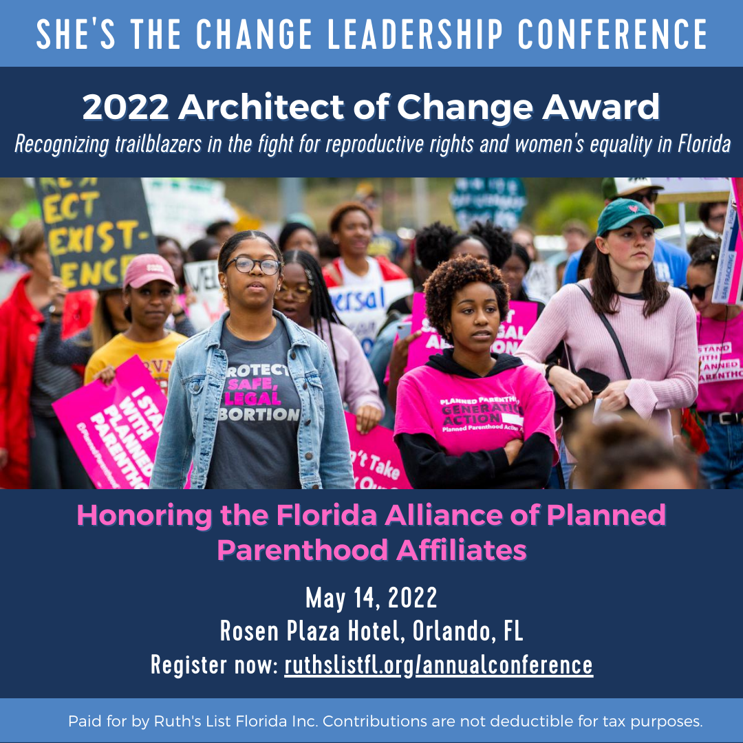 Ruth’s List Florida is excited to announce that the Florida Alliance of Planned Parenthood Affiliates (FAPPA) will receive the 2022 Architect of Change Award at our annual She’s the Change Conference. The Architect of Change award recognizes trailblazers in the fight for reproductive rights and women’s equality in Florida. Previous award recipients include the Honorable Arthenia Joyner (2017), the Honorable Betty Castor (2018) and the Honorable Alex Sink (2019).