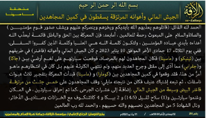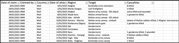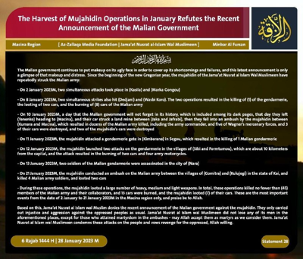 The most important clash during the month of January manifested itself in an ambush on the road between Kumara and Macina on January 10. Al-Qaeda affiliates claim to have killed dozens of Malian soldiers and five Wagner mercenaries. | Near the end of the month az-Zallaqa Media published an overview of JNIM attacks troughout Mali during January 2023: |