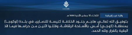 Another notable attack, claimed by ISWAP, was on a church in the area of Kogi. The numbers of attacks on Christian villages and churches are on the rise throughout the entire territory of the Islamic State in Africa. This attack can hardly be regarded as an isolated incident. Likely the attacks on Christians will continue throughout the following weeks and months. |