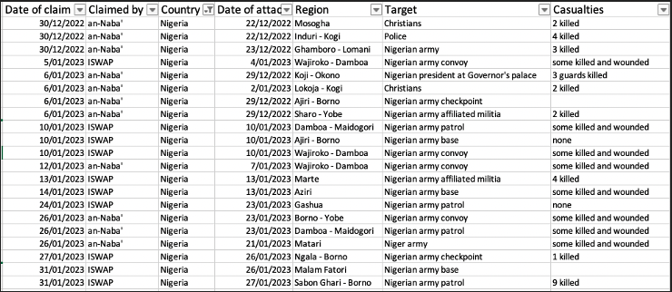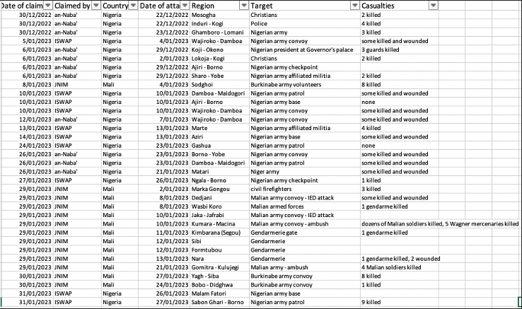 Most attacks were small scale clashes with the Nigerian army, or, in the case of JNIM, with the Malian gendarmerie, although there are some significant targets to be mentioned. ISWAP The majority of the attacks carried out by ISWAP during January 2023 were aimed at the Nigerian army. Most of the attacks seem to be low-scale hit-and-run operations resulting in a relatively low casualty count. |